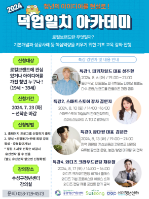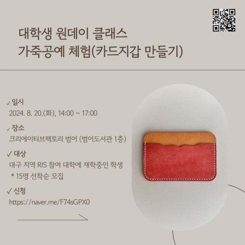 현재 모집 중 검색폼 대구광역시는 해당 페이지를 정보제공을 위한 목적으로 플랫폼을 운영하며, 각 게시글의 내용 및 운영방침에 대한 책임을 지지 않습니다. 대구광역시청년센터 사업 모아보기 전체보기 분야 : 전체 지원사업 채용/인턴/알바 기자단/서포터즈/자원봉사 공모전 교육/강연/토론 축제/공연/전시 커뮤니티활동 기타 정렬 : 전체 신규등록순 모집마감순 상태 : 전체 진행중 종료 기간 설정 검색 검색어 입력 꿀정보등록 누구나 쉽고 빠르게 청년정보를 등록하여 홍보할 수 있습니다. 전체선택 종료 [2024 덕업일치 아카데미] - 기초교육 강좌 수성구청년센터 ~ 2024.08.19 종료 청년문화예술패스 출시 100일 기념 이벤트 문화체육관광부, 한국문화예술위원회 ~ 2024.08.18 종료 청년들을 위한 인문집단프로그램 <생각사이-다> 청년29기 모집 (온라인 진행) 가톨릭대학교 김수환추기경연구소 ~ 2024.08.18 종료 시제품 개발 프로젝트 '상상 플러스' 대구광역시청소년문화의집 꼼지락발전소 ~ 2024.08.17 종료 『파도의 아이들』 정수윤 작가 북토크 모집 차방책방 ~ 2024.08.17 종료 『'24년 미래내일일경험 인턴형』 5기 사회복지분야 인턴모집 (사)중소기업기술혁신협회 대구경북지회 ~ 2024.08.16 종료 동구청 두번째 학교 성인지통합 전문강사과정 로하스교육연구소 학교폭력예방 종합지원센터 ~ 2024.08.16 종료 대학생 원데이 클래스 - 가죽공예 체험(카드지갑 만들기) 참가 학생 모집 (~8/16) 대구경북지역혁신플랫폼 전자정보기기사업단 ~ 2024.08.16 291 292 293 294 295 296 297 298 299 300