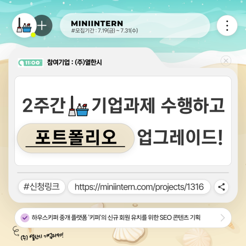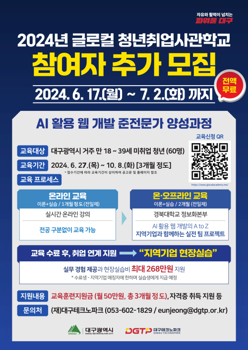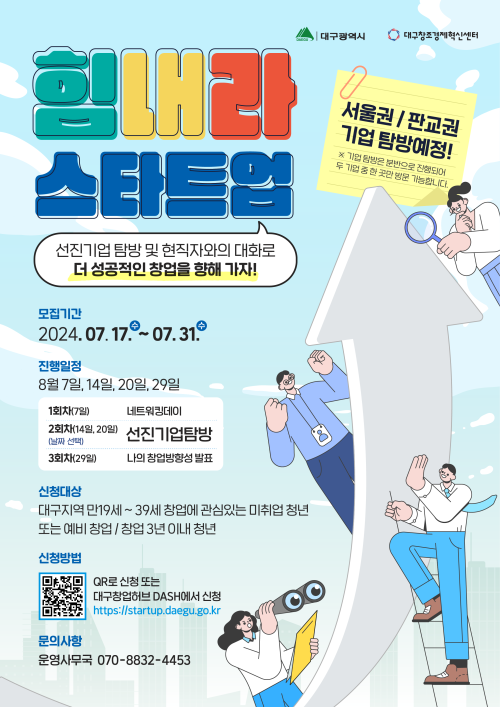 현재 모집 중 검색폼 대구광역시는 해당 페이지를 정보제공을 위한 목적으로 플랫폼을 운영하며, 각 게시글의 내용 및 운영방침에 대한 책임을 지지 않습니다. 대구광역시청년센터 사업 모아보기 전체보기 분야 : 전체 지원사업 채용/인턴/알바 기자단/서포터즈/자원봉사 공모전 교육/강연/토론 축제/공연/전시 커뮤니티활동 기타 정렬 : 전체 신규등록순 모집마감순 상태 : 전체 진행중 종료 기간 설정 검색 검색어 입력 꿀정보등록 누구나 쉽고 빠르게 청년정보를 등록하여 홍보할 수 있습니다. 전체선택 종료 2024년 글로컬 청년취업사관학교 참여자 추가모집(연장) (재)대구테크노파크 ~ 2024.0702 종료 대구 청년신체건강증진서비스(1:1 PT 개인레슨(헬스/다이어트/체형교정) 헬스케어(경북대학교체육진흥센터/계명문화대학교 헬스피아) ~ 2024.07.31 종료 도시혁신<제대로 리빙랩> 도시문제발굴단 ‘시티 솔루션스(City, Solution, Us)’ 모집 대구테크노파크, 협동조합 소이랩 ~ 2024.07.31 종료 [미니인턴X열한시] 마케팅 전략 짜고 포트폴리오 업그레이드 할 사람!? 구로청년이룸 ~ 2024.07.31 종료 빛나는 문화우체국 이야기 웹툰/이모티콘 제작 교육 참여자 모집 달성문화도시센터 ~ 2024.07.31 종료 42경산 온라인 모집설명회 (재)경산이노베이션아카데미 ~ 2024.07.31 종료 2024년 대구청년 슬기로운 인생계획 지원사업_[힘내라 스타트업] 대구광역시, (재)대구창조경제혁신센터 ~ 2024.07.31 종료 클래식과 가까워지기<3인의 피아니스트가 함께하는 건반 위의 무곡> (재)대구동구문화재단 아양아트센터 ~ 2024.07.31 301 302 303 304 305 306 307 308 309 310