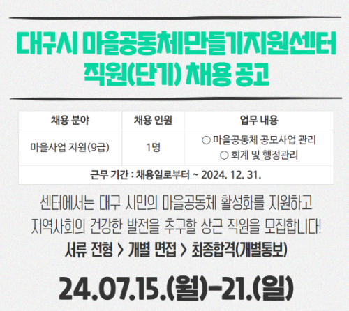 현재 모집 중 검색폼 대구광역시는 해당 페이지를 정보제공을 위한 목적으로 플랫폼을 운영하며, 각 게시글의 내용 및 운영방침에 대한 책임을 지지 않습니다. 대구광역시청년센터 사업 모아보기 전체보기 분야 : 전체 지원사업 채용/인턴/알바 기자단/서포터즈/자원봉사 공모전 교육/강연/토론 축제/공연/전시 커뮤니티활동 기타 정렬 : 전체 신규등록순 모집마감순 상태 : 전체 진행중 종료 기간 설정 검색 검색어 입력 꿀정보등록 누구나 쉽고 빠르게 청년정보를 등록하여 홍보할 수 있습니다. 전체선택 종료 '익숙한 건축의 이유' 건축사 전보림 작가와 함께하는 온라인 독서모임 세모람 ~ 2024.07.21 종료 코드잇 스프린트 프론트엔드 부트캠프 코드잇 ~ 2024.07.21 종료 대구시마을공동체만들기지원센터 채용 공고(단기 계약) 대구시마을공동체만들기지원센터 ~ 2024.07.21 종료 초보비건모여라 시즌2 대구동물권행동 비긴 ~ 2024.07.21 종료 '인공지능과 놀이' 강연 대구경북인문학협동조합 ~ 2024.07.20 종료 2024 애니먼협동조합 상반기 판매.기획 MD 채용공고 애니먼협동조합 ~ 2024.07.20 종료 2024 애니먼협동조합 / 콘텐츠 마케터 경력직 채용 애니먼협동조합 ~ 2024.07.20 종료 대구광역시 가족돌봄 청소년/청년 실태조사 대구광역시행복진흥사회서비스원/(주)리서치프로 ~ 2024.07.20 311 312 313 314 315 316 317 318 319 320