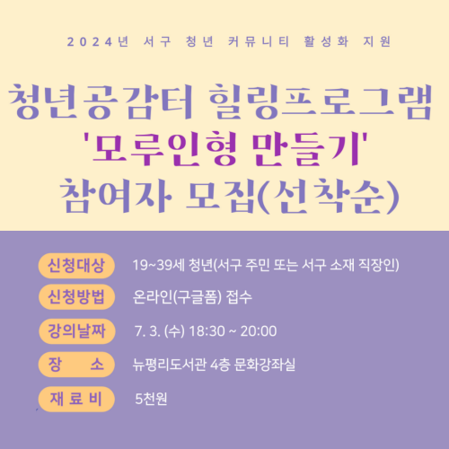 현재 모집 중 검색폼 대구광역시는 해당 페이지를 정보제공을 위한 목적으로 플랫폼을 운영하며, 각 게시글의 내용 및 운영방침에 대한 책임을 지지 않습니다. 대구광역시청년센터 사업 모아보기 전체보기 분야 : 전체 지원사업 채용/인턴/알바 기자단/서포터즈/자원봉사 공모전 교육/강연/토론 축제/공연/전시 커뮤니티활동 기타 정렬 : 전체 신규등록순 모집마감순 상태 : 전체 진행중 종료 기간 설정 검색 검색어 입력 꿀정보등록 누구나 쉽고 빠르게 청년정보를 등록하여 홍보할 수 있습니다. 전체선택 종료 AI 예감' 저자와 함께하는 온라인 독서모임 세모람 ~ 2024.07.04 종료 「2024 소셜 리빙랩 청년포럼」 기획추진단 모집 더컴퍼니씨협동조합 ~ 2024.07.04 종료 [연극] '그대는 봄' (7월 특별공연 선착순 무료) 대구지속가능발전협의회 도시공동체분과 ~ 2024.07.04 종료 (7.3.수 모루인형만들기 선착순모집)2024년 서구 청년 커뮤니티 활성화 지원 참여자 모집 서구청 교육청소년과 ~ 2024.07.03 종료 <후 불어 꿀떡 먹고 꺽>, <맛난 부사> 북토크 치우친 취향 ~ 2024.07.03 종료 9가지 취향커뮤니티_취함_참가자 모집 커뮤니티디자인 내마음은 콩밭 협동조합 ~ 2024.07.03 종료 '최고의 프로덕트는 무엇이 다른가' 저자와 함께하는 랜선 책모임 세모람 ~ 2024.07.03 종료 협업 프로젝트 참가 기업 모집 (~7/3) 대구경북지역혁신플랫폼 전자정보기기사업단 ~ 2024.07.03 311 312 313 314 315 316 317 318 319 320