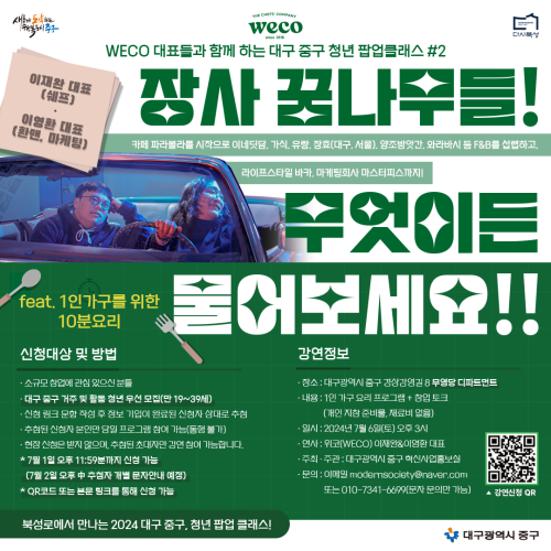현재 모집 중 검색폼 대구광역시는 해당 페이지를 정보제공을 위한 목적으로 플랫폼을 운영하며, 각 게시글의 내용 및 운영방침에 대한 책임을 지지 않습니다. 대구광역시청년센터 사업 모아보기 전체보기 분야 : 전체 지원사업 채용/인턴/알바 기자단/서포터즈/자원봉사 공모전 교육/강연/토론 축제/공연/전시 커뮤니티활동 기타 정렬 : 전체 신규등록순 모집마감순 상태 : 전체 진행중 종료 기간 설정 검색 검색어 입력 꿀정보등록 누구나 쉽고 빠르게 청년정보를 등록하여 홍보할 수 있습니다. 전체선택 종료 🍀[2024 대구 중구 청년 팝업 클래스 #2] 청년창업가 위코 이재완&이영환(환맨) 공동대표 팝업 클래스 신청자 모집🍀 대구광역시 중구 혁신사업홍보실 주최·주관 / 현대사회(운영사) ~ 2024.07.01 종료 프로크리에이트 아이패드 드로잉 드로잉쥬&청바지 ~ 2024.07.01 종료 [미술] 월요일 밤, 나의 팔레트(7/8 첫 모임) 나를위함 ~ 2024.07.01 종료 제12회 산업통상자원부 공공데이터 활용 아이디어 공모전 산업통상자원부 ~ 2024.07.01 종료 대구시청자미디어센터 7월 상설미디어교육 수강생모집 대구시청자미디어센터 ~ 2024.06.30 종료 사이와 너머 : 시간과 시간 사이, 이곳 너머 저곳을 상상해 보는 황금동 작업실 ~ 2024.06.30 종료 2024 남구 문화가 있는 날 '15분 문화마실' 인디053, 남구청년센터 ~ 2024.06.30 종료 꼼지락발전소 교육문화 7~9월 프로그램 개강 대구시청소년문화의집 꼼지락발전소 ~ 2024.06.30 321 322 323 324 325 326 327 328 329 330