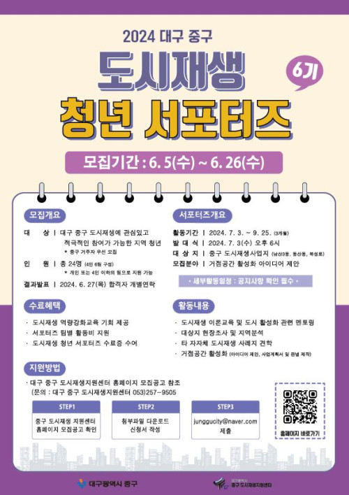 현재 모집 중 검색폼 대구광역시는 해당 페이지를 정보제공을 위한 목적으로 플랫폼을 운영하며, 각 게시글의 내용 및 운영방침에 대한 책임을 지지 않습니다. 대구광역시청년센터 사업 모아보기 전체보기 분야 : 전체 지원사업 채용/인턴/알바 기자단/서포터즈/자원봉사 공모전 교육/강연/토론 축제/공연/전시 커뮤니티활동 기타 정렬 : 전체 신규등록순 모집마감순 상태 : 전체 진행중 종료 기간 설정 검색 검색어 입력 꿀정보등록 누구나 쉽고 빠르게 청년정보를 등록하여 홍보할 수 있습니다. 전체선택 종료 2024년 여성 1인가구가 함께하는 커뮤니티 참여자 모집(하반기) 달서구가족센터 ~ 2024.06.27 종료 2024 HIA 오픈데이, 아이디어 공모전 한국에자이, 협동조합 소이랩 ~ 2024.06.26 종료 [미니인턴X버닛] 운동 좋아하는 예비 마케터를 위한 프로그램! 구로청년이룸 ~ 2024.06.26 종료 남구청년센터 문화의 날 남구청년센터 ~ 2024.06.26 종료 2024 대구 중구 도시재생 청년서포터즈 모집 대구 중구청/대구중구도시재생지원센터 ~ 2024.06.26 종료 '사랑과 법 - 생존을 위한 두 가지 요건에 관한 이야기' 저자와 함께하는 온라인 독서모임 세모람 ~ 2024.06.26 종료 부채상담소 '소화기' 부채상담사 양성과정 - 부채금융 아카데미 대구청년연대은행 디딤 ~ 2024.06.26 종료 [독서] 부와 성공을 위한, 포부스 (7/7 첫 모임) 나를위함 ~ 2024.06.26 321 322 323 324 325 326 327 328 329 330