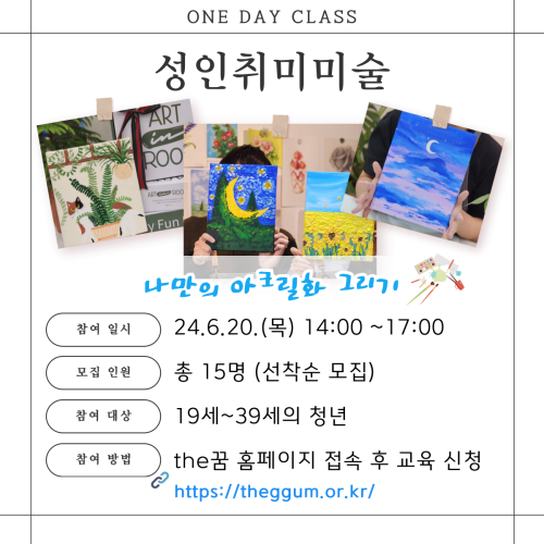 현재 모집 중 검색폼 대구광역시는 해당 페이지를 정보제공을 위한 목적으로 플랫폼을 운영하며, 각 게시글의 내용 및 운영방침에 대한 책임을 지지 않습니다. 대구광역시청년센터 사업 모아보기 전체보기 분야 : 전체 지원사업 채용/인턴/알바 기자단/서포터즈/자원봉사 공모전 교육/강연/토론 축제/공연/전시 커뮤니티활동 기타 정렬 : 전체 신규등록순 모집마감순 상태 : 전체 진행중 종료 기간 설정 검색 검색어 입력 꿀정보등록 누구나 쉽고 빠르게 청년정보를 등록하여 홍보할 수 있습니다. 전체선택 종료 [독서] 토요일 낮, 심리 책방 (7/20 첫 모임) 나를위함 ~ 2024.06.19 종료 '할리우드로 출근합니다' 문성환 저자와 함께하는 온라인 독서모임 세모람 ~ 2024.06.19 종료 📢 성인취미미술 '나만의 아크릴화 그리기' 동구청년센터the꿈 ~ 2024.06.19 종료 슬기로운 남가네 참여자 모집 대구남구가족센터 ~ 2024.06.19 종료 [찾아가는 문화우체국] 오해를 오예! 달성문화도시센터 ~ 2024.06.18 종료 [서구종합사회복지관] 하바리움 무드등 만들기 무료수강생 모집! 서구종합사회복지관 ~ 2024.06.18 종료 '마흔, 너무 행복하지도 불행하지도 않게' 저자와 함께하는 온라인 독서모임 세모람 ~ 2024.06.18 종료 [독서] 수요일 저녁, 고전살롱(수) (7/17 첫 모임) 나를위함 ~ 2024.06.18 321 322 323 324 325 326 327 328 329 330