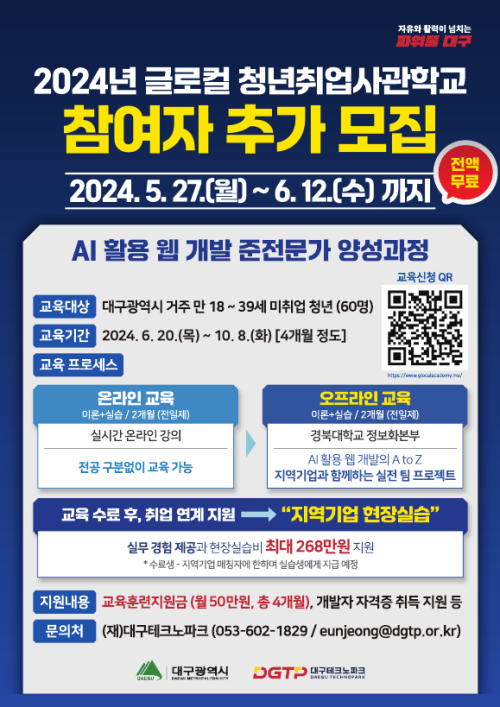 현재 모집 중 검색폼 대구광역시는 해당 페이지를 정보제공을 위한 목적으로 플랫폼을 운영하며, 각 게시글의 내용 및 운영방침에 대한 책임을 지지 않습니다. 대구광역시청년센터 사업 모아보기 전체보기 분야 : 전체 지원사업 채용/인턴/알바 기자단/서포터즈/자원봉사 공모전 교육/강연/토론 축제/공연/전시 커뮤니티활동 기타 정렬 : 전체 신규등록순 모집마감순 상태 : 전체 진행중 종료 기간 설정 검색 검색어 입력 꿀정보등록 누구나 쉽고 빠르게 청년정보를 등록하여 홍보할 수 있습니다. 전체선택 종료 2024년 글로컬 청년취업사관학교 참여자 추가모집 공고 (재)대구테크노파크 ~ 2024.06.12 종료 [글쓰기] 토요일 밤, 여섯 문장 (feat. 와인페어링) (7/6 첫 모임) 나를위함 ~ 2024.06.11 종료 자원봉사 기초교육 수성구자원봉사센터 ~ 2024.06.11 종료 희망학습마을 교육 청년마루 ~ 2024.06.11 종료 청년 1인가구 '하나의 하루' 추가모집 안내 대구서구가족센터 ~ 2024.06.10 종료 💥모집💥 낭만수집단 쌍걸 ~ 2024.06.10 종료 [글쓰기] 금요일 밤, 마음씀 (7/5 첫 모임) 나를위함 ~ 2024.06.10 종료 독립 다큐멘터리 제작과정 수강생 모집 대구영상미디어센터 ~ 2024.06.10 331 332 333 334 335 336 337 338 339 340