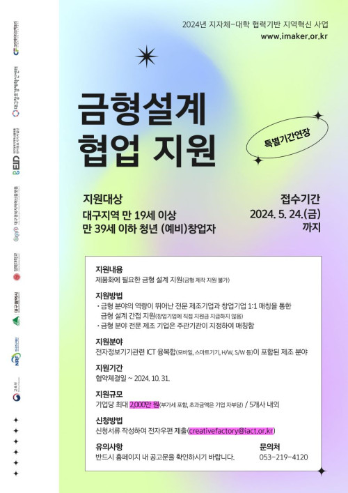 현재 모집 중 검색폼 대구광역시는 해당 페이지를 정보제공을 위한 목적으로 플랫폼을 운영하며, 각 게시글의 내용 및 운영방침에 대한 책임을 지지 않습니다. 대구광역시청년센터 사업 모아보기 전체보기 분야 : 전체 지원사업 채용/인턴/알바 기자단/서포터즈/자원봉사 공모전 교육/강연/토론 축제/공연/전시 커뮤니티활동 기타 정렬 : 전체 신규등록순 모집마감순 상태 : 전체 진행중 종료 기간 설정 검색 검색어 입력 꿀정보등록 누구나 쉽고 빠르게 청년정보를 등록하여 홍보할 수 있습니다. 전체선택 종료 [다가오는 시의 언어 03] 강우근 신이인 차유오 차현준 시인 공동 낭독회 이모지 ~ 2024.05.24 종료 금형 설계 협업 지원 프로그램 참가 기업 모집 (~5/24) 대구경북지역혁신플랫폼 전자정보기기사업단 ~ 2024.05.24 종료 하나 소셜벤처유니버시티 하나금융그룹, 고용노동부 ~ 2024.05.24 종료 2024 건강가정캠페인 "함께라서 더 즐거운 ;) 우리 가족" 안내 대구서구가족센터 ~ 2024.05.24 종료 2024 <글로컬 F&B 허슬러 in 청도> 참여자 모집 (사)경북시민재단 ~ 2024.05.24 종료 <글로컬 F&B 허슬러 in 청도> 프로그램 안내 MYSC, 경북시민재단, 두더지 프로젝트 ~ 2024.05.24 종료 남구청년센터 문화아카데미 시즌2 大모집! 남구청년센터 ~ 2024.05.24 종료 [WISET] 2024년 재직자 실무역량 강화를 위한 온라인 과정 2차 (신청기간 ~ 5/24) WISET ~ 2024.05.24 341 342 343 344 345 346 347 348 349 350