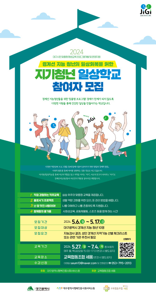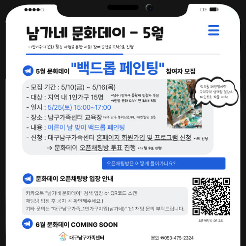 현재 모집 중 검색폼 대구광역시는 해당 페이지를 정보제공을 위한 목적으로 플랫폼을 운영하며, 각 게시글의 내용 및 운영방침에 대한 책임을 지지 않습니다. 대구광역시청년센터 사업 모아보기 전체보기 분야 : 전체 지원사업 채용/인턴/알바 기자단/서포터즈/자원봉사 공모전 교육/강연/토론 축제/공연/전시 커뮤니티활동 기타 정렬 : 전체 신규등록순 모집마감순 상태 : 전체 진행중 종료 기간 설정 검색 검색어 입력 꿀정보등록 누구나 쉽고 빠르게 청년정보를 등록하여 홍보할 수 있습니다. 전체선택 종료 2024청년도전지원사업 달서구청년도전지원사업본부 ~ 2024.05.18 종료 독립출판 체험 [매거진 꼼지] 대구광역시청소년문화의집 꼼지락발전소 ~ 2024.05.18 종료 [트레킹] 토요일 낮, 낭만트레킹 (5/18 모임) 나를위함 ~ 2024.05.18 종료 나의 퍼스널 자원봉사는? 수성구자원봉사센터 ~ 2024.05.17 종료 경계선 지능 청년의 일상회복을 위한 "지기청년 일상학교" 참여자 모집 교육협동조합 세움 ~ 2024.05.17 종료 5월 남가네 문화데이 참여자 모집 대구남구가족센터 ~ 2024.05.17 대구광역시청년센터 종료 [제2024-03호] 대구광역시청년센터 인재채용 공고 대구광역시청년센터 ~ 2024.05.17 종료 [트레킹] 토요일 아침, 새싹트레킹 (5/18 첫 모임) 나를위함 ~ 2024.05.17 341 342 343 344 345 346 347 348 349 350