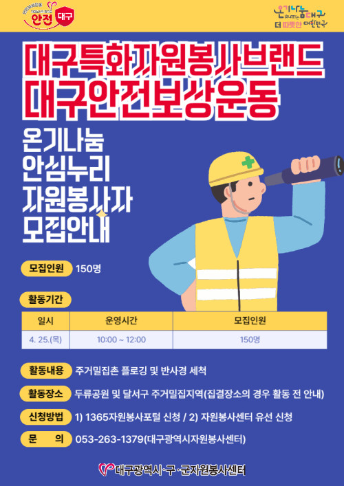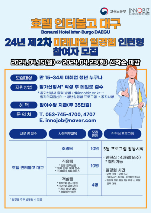 현재 모집 중 검색폼 대구광역시는 해당 페이지를 정보제공을 위한 목적으로 플랫폼을 운영하며, 각 게시글의 내용 및 운영방침에 대한 책임을 지지 않습니다. 대구광역시청년센터 사업 모아보기 전체보기 분야 : 전체 지원사업 채용/인턴/알바 기자단/서포터즈/자원봉사 공모전 교육/강연/토론 축제/공연/전시 커뮤니티활동 기타 정렬 : 전체 신규등록순 모집마감순 상태 : 전체 진행중 종료 기간 설정 검색 검색어 입력 꿀정보등록 누구나 쉽고 빠르게 청년정보를 등록하여 홍보할 수 있습니다. 전체선택 종료 2024 대한민국 과학축제_WISET 생성형 AI 진로 체험 세미나 참여자 모집 한국여성과학기술인육성재단 ~ 2024.04.25 종료 창업 멘토링 특강 [여성창업, 어떻게 시작하나요?] 대구여성인력개발센터 ~ 2024.04.24 대구광역시청년센터 종료 2024 청년생활종합상담사업 청년상담소 커뮤니티 집단상담 1회차 프로그램 참여자 모집 대구광역시청년센터 ~ 2024.04.24 종료 현재를 탐구하는 영화 모임 [오늘의 영화] 레벨제로 ~ 2024.04.24 종료 [독서모임] ㅇㅅㄷ독서모임 여행자의 책 ~ 2024.04.24 종료 국악퓨전콘서트를 해설과 함께 쉽게 접할 수 있다고? (재)대구동구문화재단 아양아트센터 ~ 2024.04.24 종료 『'24년 미래내일일경험 인턴형』 2기 호텔인터불고 참여자 모집 (사)중소기업기술혁신협회 대구경북지회 ~ 2024.04.23 종료 대구안전보상운동 "온기나눔, 안심누리" 자원봉사자 모집 안내 대구광역시자원봉사센터 ~ 2024.04.23 361 362 363 364 365 366 367 368 369 370