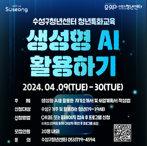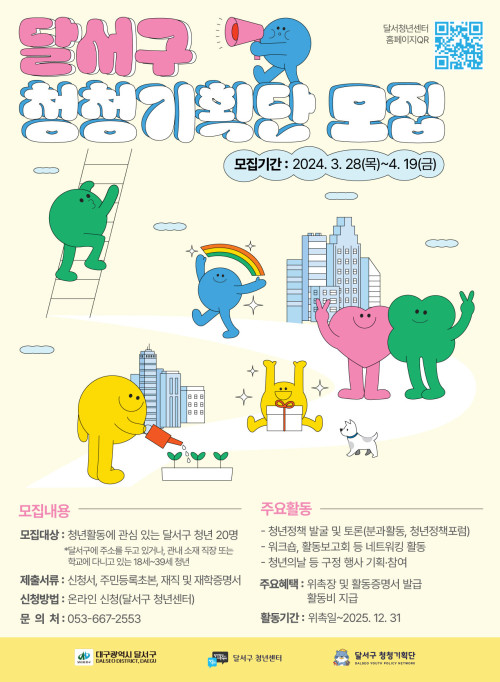 현재 모집 중 검색폼 대구광역시는 해당 페이지를 정보제공을 위한 목적으로 플랫폼을 운영하며, 각 게시글의 내용 및 운영방침에 대한 책임을 지지 않습니다. 대구광역시청년센터 사업 모아보기 전체보기 분야 : 전체 지원사업 채용/인턴/알바 기자단/서포터즈/자원봉사 공모전 교육/강연/토론 축제/공연/전시 커뮤니티활동 기타 정렬 : 전체 신규등록순 모집마감순 상태 : 전체 진행중 종료 기간 설정 검색 검색어 입력 꿀정보등록 누구나 쉽고 빠르게 청년정보를 등록하여 홍보할 수 있습니다. 전체선택 종료 나의 퍼스널 자원봉사는? 수성구자원봉사센터 ~ 2024.04.19 종료 제 6기 달서구 청청(靑廳) 기획단 모집 공고 달서구 ~ 2024.04.19 종료 [수성구청년센터 청년특화교육] 생성형 AI활용하기 수성구청년센터 ~ 2024.04.19 종료 (범죄도시4관람) 2024년 제1차 국민내일배움DAY 대구지역인적자원개발위원회 ~ 2024.04.18 종료 4월 상설미디어교육 수강생모집[라이브 스트리밍을 위한 OBS 특강] 대구시청자미디어센터 ~ 2024.04.18 종료 2024년 음주예방 서포터즈 다오(DAO) 3기 모집 대구동구중독관리통합지원센터 ~ 2024.04.18 종료 [한국산림복지진흥원] 2024년도 취약계층 산림복지일자리 아카데미 참가자 모집 공고 한국산림복지진흥원 ~ 2024.04.17 종료 2030 청년층이 함께하는 집단상담 & 자조모임 참여자 모집 달서구가족센터 ~ 2024.04.17 361 362 363 364 365 366 367 368 369 370