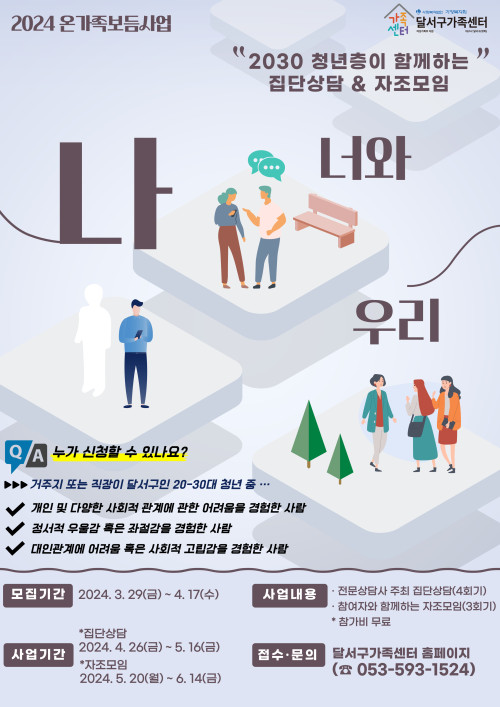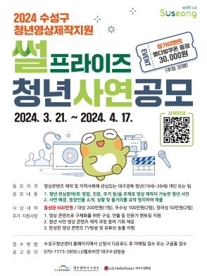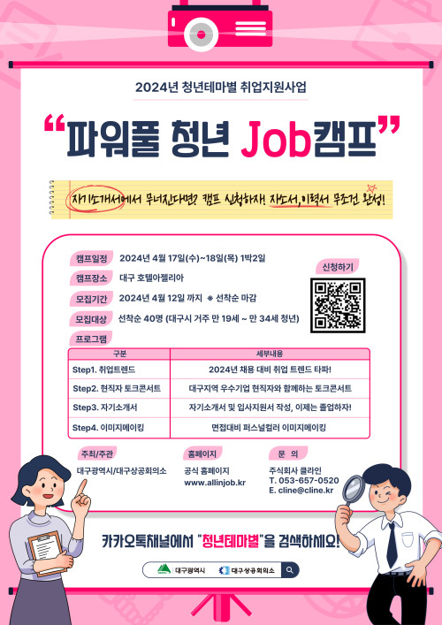 현재 모집 중 검색폼 대구광역시는 해당 페이지를 정보제공을 위한 목적으로 플랫폼을 운영하며, 각 게시글의 내용 및 운영방침에 대한 책임을 지지 않습니다. 대구광역시청년센터 사업 모아보기 전체보기 분야 : 전체 지원사업 채용/인턴/알바 기자단/서포터즈/자원봉사 공모전 교육/강연/토론 축제/공연/전시 커뮤니티활동 기타 정렬 : 전체 신규등록순 모집마감순 상태 : 전체 진행중 종료 기간 설정 검색 검색어 입력 꿀정보등록 누구나 쉽고 빠르게 청년정보를 등록하여 홍보할 수 있습니다. 전체선택 종료 안심 청아람 더 영(The Young) 행복주택 입주자 모집 대구도시개발공사 ~ 2024.04.17 종료 2030 청년층이 함께하는 집단상담 & 자조모임 참여자 모집 달서구가족센터 ~ 2024.04.17 종료 [ 공모/지원사업 ] "썰프라이즈" 청년 공모전 "청년들의 창작의욕 고취와 문화 발신을 위해 청년 영상 스토리를 공모합니다!" 수성구청년센터 ~ 2024.04.17 종료 (교육안내) 3월~4월 제품개발 및 공정혁신을 위한 전문기술 교육 첨단정보통신융합산업기술원 ~ 2024.04.17 종료 자원봉사 기초교육 수성구자원봉사센터 ~ 2024.04.16 종료 소규모 모임 야간 이용 체험단 모집 어바웃웍스 스튜디오 ~ 2024.04.16 종료 해피파트너스 원데이클래스 무료 수강생 모집! 서구종합사회복지관 ~ 2024.04.16 종료 파워풀 청년 JOB 캠프-2024년 청년테마별 취업지원사업 (주)클라인 ~ 2024.04.16 361 362 363 364 365 366 367 368 369 370