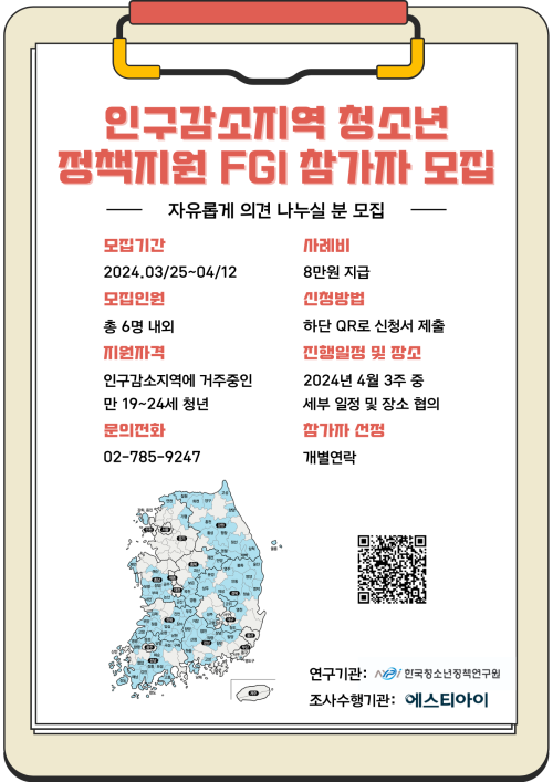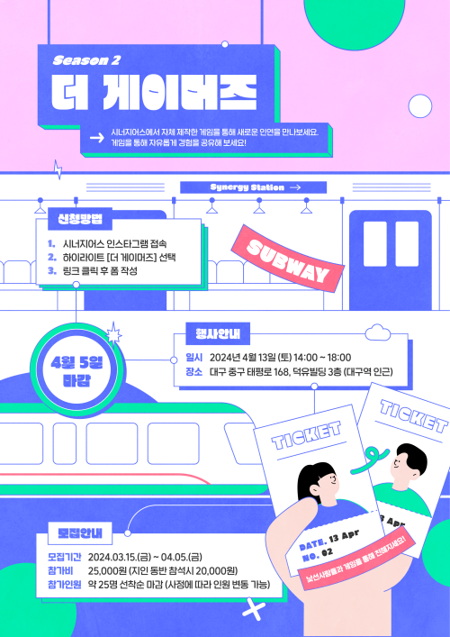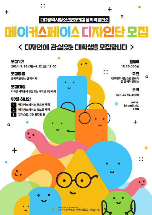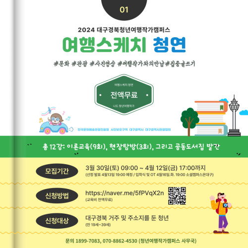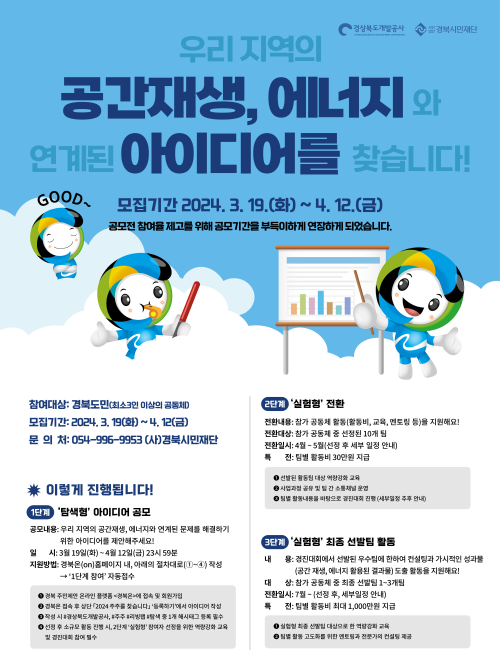 현재 모집 중 검색폼 대구광역시는 해당 페이지를 정보제공을 위한 목적으로 플랫폼을 운영하며, 각 게시글의 내용 및 운영방침에 대한 책임을 지지 않습니다. 대구광역시청년센터 사업 모아보기 전체보기 분야 : 전체 지원사업 채용/인턴/알바 기자단/서포터즈/자원봉사 공모전 교육/강연/토론 축제/공연/전시 커뮤니티활동 기타 정렬 : 전체 신규등록순 모집마감순 상태 : 전체 진행중 종료 기간 설정 검색 검색어 입력 꿀정보등록 누구나 쉽고 빠르게 청년정보를 등록하여 홍보할 수 있습니다. 전체선택 종료 "피난처에서 만나요" 4월 독서모임 <공정감각> 기본소득대구네트워크x책빵고스란히 ~ 2024.04.13 종료 [공모] 우리지역의 공간재생, 에너지와 연계된 아이디어를 찾습니다! 경상북도개발공사, (사)경북시민재단 ~ 2024.04.12 종료 [토요일] 오프라인 보드게임 모임 시너지어스 더게이머즈 ~ 2024.04.12 종료 [the common community] talk! 기후위기로 인한 몽골과 미국의 이주위기 🚛 더커먼 ~ 2024.04.12 종료 인구감소지역 청소년 정책지원 FGI 참가자 모집 한국청소년정책연구원, 에스티아이 ~ 2024.04.12 종료 2024 대구경북 청년여행작가캠퍼스 '여행스케치 청연' 모집 시인보호구역 ~ 2024.04.12 종료 대구광역시청소년문화의집 꼼지락발전소 <메이커스페이스 디자인단> 모집 대구광역시청소년문화의집 꼼지락발전소 ~ 2024.04.12 종료 2024년도 디지털 헬스케어/의료기기 특화 제품 개발 지원 사업 참가 기업 모집 (~4/12) 대구경북지역혁신플랫폼 전자정보기기사업단 ~ 2024.04.12 361 362 363 364 365 366 367 368 369 370