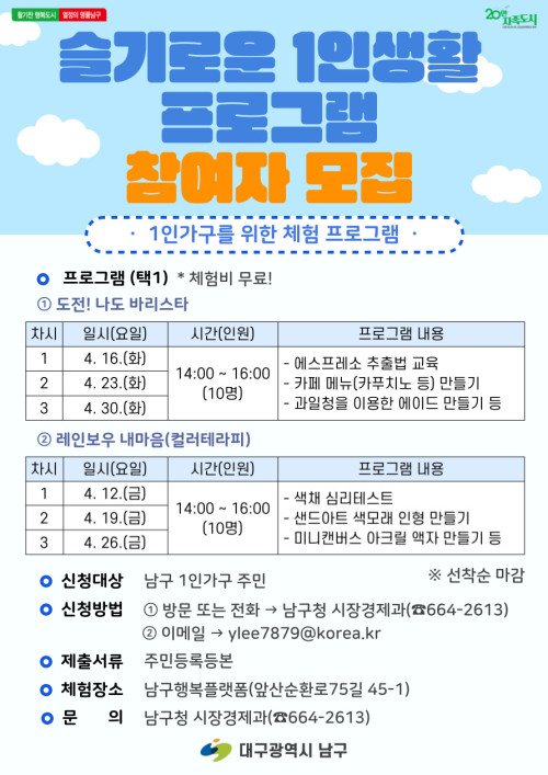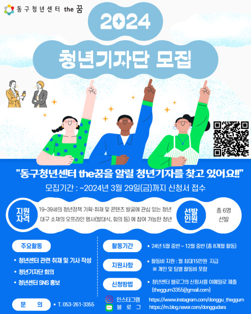 현재 모집 중 검색폼 대구광역시는 해당 페이지를 정보제공을 위한 목적으로 플랫폼을 운영하며, 각 게시글의 내용 및 운영방침에 대한 책임을 지지 않습니다. 대구광역시청년센터 사업 모아보기 전체보기 분야 : 전체 지원사업 채용/인턴/알바 기자단/서포터즈/자원봉사 공모전 교육/강연/토론 축제/공연/전시 커뮤니티활동 기타 정렬 : 전체 신규등록순 모집마감순 상태 : 전체 진행중 종료 기간 설정 검색 검색어 입력 꿀정보등록 누구나 쉽고 빠르게 청년정보를 등록하여 홍보할 수 있습니다. 전체선택 종료 광덕빌딩 8층 생명평화나눔의집 입주 단체 모집합니다. 생명평화아시아 ~ 2024.03.31 종료 1인가구 '하나의 하루' 추가 모집 대구서구가족센터 ~ 2024.03.30 종료 재주소년 박경환 『소년, 잘 지내』 북토크 공연 차방책방 ~ 2024.03.30 종료 해피파트너스 3월 실시 프로그램 안내 서구종합사회복지관 ~ 2024.03.30 종료 [남구청] 1인가구 "바리스타/컬러테라피" 프로그램 참여자 모집 남구청 시장경제과 ~ 2024.03.29 종료 자율 프로젝트 참가 학생 모집 (~3/29) 대구경북지역혁신플랫폼 전자정보기기사업단 ~ 2024.03.29 종료 [동구청년센터 the꿈]2024년 청년기자단 모집! 동구청년센터 the꿈 ~ 2024.03.29 종료 청문당 청년 기획공모전 「Z to A, 2024」 행복북구문화재단 ~ 2024.03.29 371 372 373 374 375 376 377 378 379 380