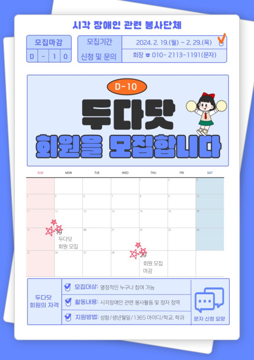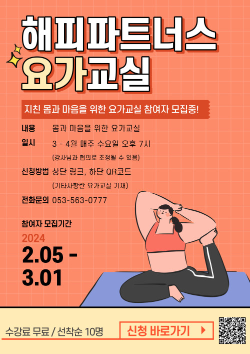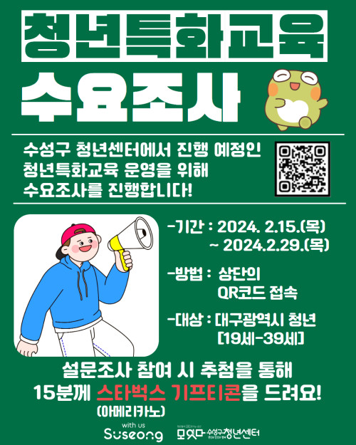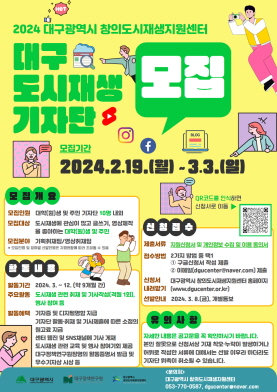 현재 모집 중 검색폼 대구광역시는 해당 페이지를 정보제공을 위한 목적으로 플랫폼을 운영하며, 각 게시글의 내용 및 운영방침에 대한 책임을 지지 않습니다. 대구광역시청년센터 사업 모아보기 전체보기 분야 : 전체 지원사업 채용/인턴/알바 기자단/서포터즈/자원봉사 공모전 교육/강연/토론 축제/공연/전시 커뮤니티활동 기타 정렬 : 전체 신규등록순 모집마감순 상태 : 전체 진행중 종료 기간 설정 검색 검색어 입력 꿀정보등록 누구나 쉽고 빠르게 청년정보를 등록하여 홍보할 수 있습니다. 전체선택 종료 2024 대구 도시재생 기자단 모집(2.19.~3.3.) 대구광역시 창의도시재생지원센터 ~ 2024.03.03 종료 대구에서 엣지있게 음악 디깅하는 법 나를위함 ~ 2024.03.03 종료 아이패드로 여는 대화의 장 나를위함 ~ 2024.03.02 종료 [서구종합사회복지관] 3월 요가교실 참여자 모집 서구종합사회복지관 ~ 2024.03.01 종료 2024 자립준비청년 건강검진 지원 중앙사회서비스원, 현대차 정몽구재단 ~ 2024.02.29 종료 3월 글쓰기 클럽 /유치한 것들이 찬란할 수 있도록/ 멤버 모집 아무의 방 ~ 2024.02.29 종료 [두다닷] 2024 두다닷 회원 모집 두다닷 ~ 2024.02.29 종료 [수성구청년센터] 2024 청년특화교육 수요조사 수성구청 ~ 2024.02.29 381 382 383 384 385 386 387 388 389 390