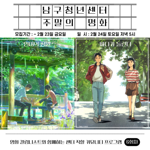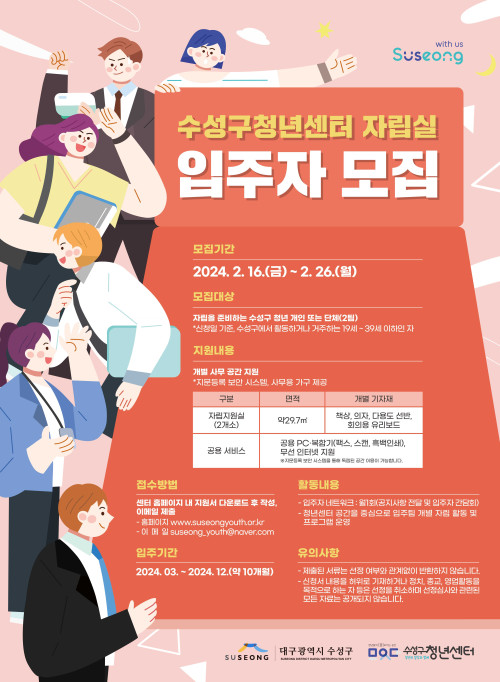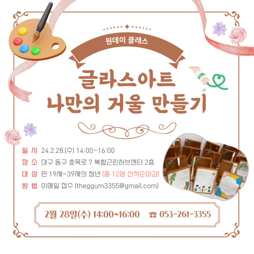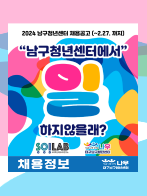 현재 모집 중 검색폼 대구광역시는 해당 페이지를 정보제공을 위한 목적으로 플랫폼을 운영하며, 각 게시글의 내용 및 운영방침에 대한 책임을 지지 않습니다. 대구광역시청년센터 사업 모아보기 전체보기 분야 : 전체 지원사업 채용/인턴/알바 기자단/서포터즈/자원봉사 공모전 교육/강연/토론 축제/공연/전시 커뮤니티활동 기타 정렬 : 전체 신규등록순 모집마감순 상태 : 전체 진행중 종료 기간 설정 검색 검색어 입력 꿀정보등록 누구나 쉽고 빠르게 청년정보를 등록하여 홍보할 수 있습니다. 전체선택 종료 남구청년센터 채용공고 남구청년센터 ~ 2024.02.27 종료 the꿈+_One-Day Class 「글라스아트 ‘나만의 거울 만들기’」 동구청년센터the꿈 ~ 2024.02.27 종료 2024 수성구청년센터 청년자립실 입주자 모집 수성구청년센터 ~ 2024.02.26 종료 대구시청자미디어센터 정회원교육+시설투어 대구시청자미디어센터 ~ 2024.02.25 종료 고전으로 새해 독서모임을 시작하세요 나를위함 ~ 2024.02.25 종료 대구 911 연기학원에서 무용강의 담당 선생님 모집합니다. 911 연기학원 ~ 2024.02.24 종료 나는 회피형? 안정형? [심화] 애착유형검사 나를위함 ~ 2024.02.23 종료 🎞️주말의 명화 - 🎥언어의 정원🎥바다가 들린다 남구청년센터 ~ 2024.02.23 381 382 383 384 385 386 387 388 389 390