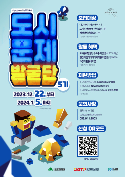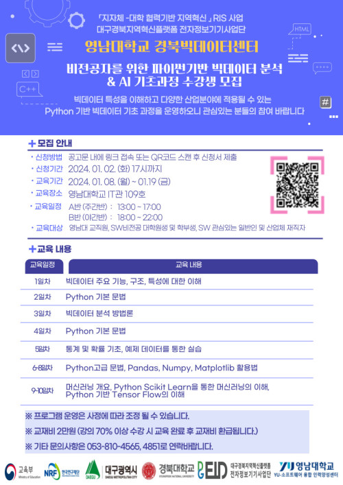 현재 모집 중 검색폼 대구광역시는 해당 페이지를 정보제공을 위한 목적으로 플랫폼을 운영하며, 각 게시글의 내용 및 운영방침에 대한 책임을 지지 않습니다. 대구광역시청년센터 사업 모아보기 전체보기 분야 : 전체 지원사업 채용/인턴/알바 기자단/서포터즈/자원봉사 공모전 교육/강연/토론 축제/공연/전시 커뮤니티활동 기타 정렬 : 전체 신규등록순 모집마감순 상태 : 전체 진행중 종료 기간 설정 검색 검색어 입력 꿀정보등록 누구나 쉽고 빠르게 청년정보를 등록하여 홍보할 수 있습니다. 전체선택 종료 2024 대구도시문제발굴단 5기 시티 리서쳐스(City, Research, Us)모집 대구테크노파크, 협동조합소이랩 ~ 2024.01.05 종료 자아성장 글쓰기 /생각은 뭉게뭉게/ 멤버 모집 아무의 방 ~ 2024.01.05 종료 글쓰기 클럽 /유치찬란/ 1월 멤버 모집 아무의 방 ~ 2024.01.04 종료 3DXpert를 활용한 장비 운용 역량 강화 교육 경북대학교 첨단정보통신융합산업기술원 ~ 2024.01.02 종료 비전공자를 위한 파이썬 기반 빅데이터 분석 & AI 기초 과정 수강생 모집 (~1/2) 대구경북지역혁신플랫폼 전자정보기기사업단 ~ 2024.01.02 종료 달서구 청년센터 2024년 공간운영단 모집 달서구 청년센터 ~ 2024.01.01 종료 2023 두근두근 페스티벌 대구광역시 달서구청 ~ 20230912 종료 2023년 대구지역인적자원개발위원회 인력양성팀(기업훈련지원) 직원 채용 공고 대구지역인적자원개발위원회(대구상공회의소) ~ 20230615 391 392 393 394 395 396 397 398 399 400