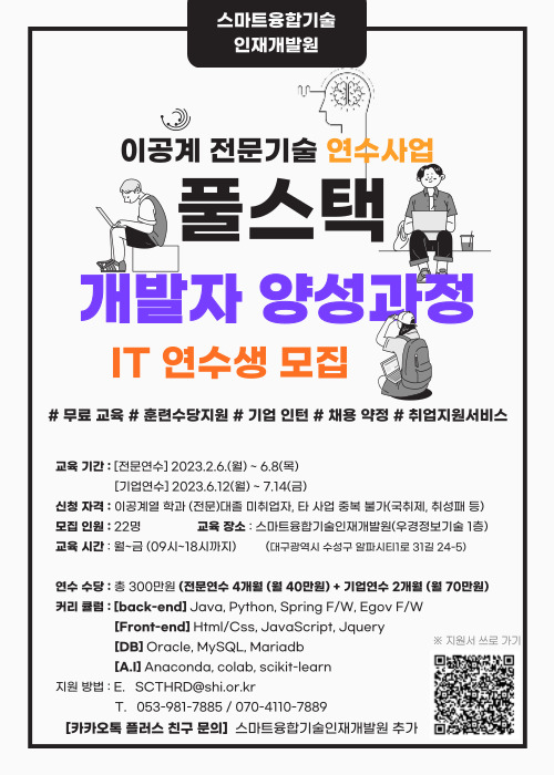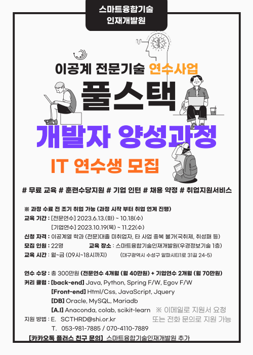 현재 모집 중 검색폼 대구광역시는 해당 페이지를 정보제공을 위한 목적으로 플랫폼을 운영하며, 각 게시글의 내용 및 운영방침에 대한 책임을 지지 않습니다. 대구광역시청년센터 사업 모아보기 전체보기 분야 : 전체 지원사업 채용/인턴/알바 기자단/서포터즈/자원봉사 공모전 교육/강연/토론 축제/공연/전시 커뮤니티활동 기타 정렬 : 전체 신규등록순 모집마감순 상태 : 전체 진행중 종료 기간 설정 검색 검색어 입력 꿀정보등록 누구나 쉽고 빠르게 청년정보를 등록하여 홍보할 수 있습니다. 전체선택 종료 [ 교육/강연 ] [2023 이공계 전문기술 연수사업] 풀스택 개발자 양성과정 IT 연수생 모집 사단법인 스마트융합기술인재개발원 ~ 20230612 종료 알파라운드 <청년 창업 자조활동 라운드 프로젝트 “알파청년 4기"> (사)함께만드는세상 사회연대은행 ~ 20230514 종료 농사기본교육후 청도농장투어! "파밍랩" 4월 모집 농업회사법인 희망토 주식회사 ~ 20230416 종료 2023년 JMT(Job MT) 행사 안내 대구지역인적자원개발위원회 ~ 20230331 종료 [2023 이공계 전문기술 연수사업] 풀스택 개발자 양성과정 IT 연수생 모집 사단법인 스마트융합기술인재개발원 ~ 20230205 종료 2023 C-Academy 온라인 기초 교육 과정 참가자 모집 대구창조경제혁신센터 ~ 2023.12.31 종료 말하는고양이 신규 활동가 모집 말하는고양이 ~ 2023.12.31 종료 <긍정심리 행동활성화기반 어플 사용자 연구> 참여 안내 가톨릭대학교 간호대학 도담이 연구팀 ~ 2023.12.31 401 402 403 404 405 406 407 408 409 410