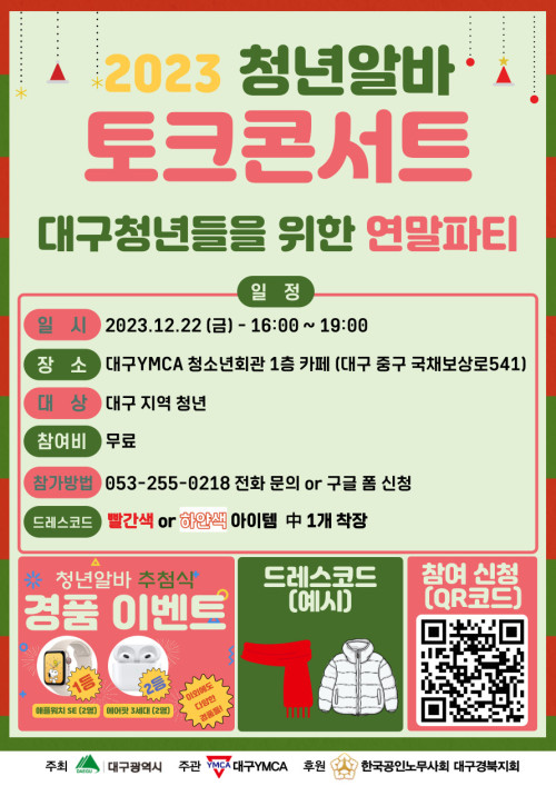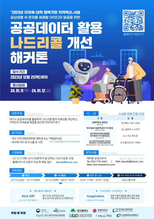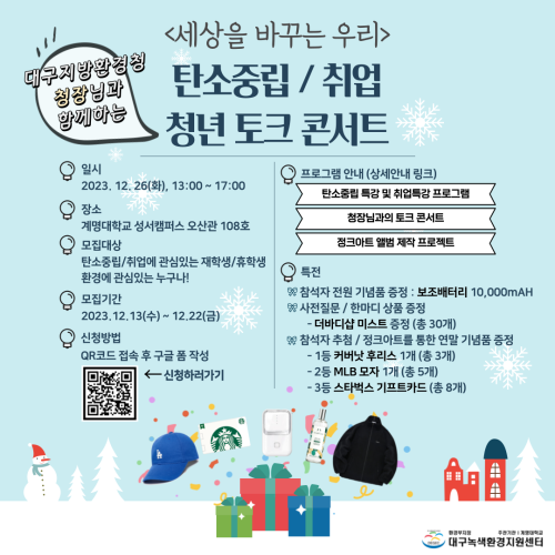 현재 모집 중 검색폼 대구광역시는 해당 페이지를 정보제공을 위한 목적으로 플랫폼을 운영하며, 각 게시글의 내용 및 운영방침에 대한 책임을 지지 않습니다. 대구광역시청년센터 사업 모아보기 전체보기 분야 : 전체 지원사업 채용/인턴/알바 기자단/서포터즈/자원봉사 공모전 교육/강연/토론 축제/공연/전시 커뮤니티활동 기타 정렬 : 전체 신규등록순 모집마감순 상태 : 전체 진행중 종료 기간 설정 검색 검색어 입력 꿀정보등록 누구나 쉽고 빠르게 청년정보를 등록하여 홍보할 수 있습니다. 전체선택 종료 탄소중립/취업 청년 토크 콘서트 대구녹색환경지원센터 ~ 2023.12.22 종료 2023 청년알바 토크콘서트 대구YMCA ~ 2023.12.22 종료 대구시청자미디어센터 SNS구독 이벤트 대구시청자미디어센터 ~ 2023.12.22 종료 (재)행복북구문화재단 '지역문화포럼'을 개최합니다 (재)행복북구문화재단 ~ 2023.12.21 종료 12/21 대구지역 대학(원)생·지역청년을 위한 창업특강 "그렇게 우리는 창업가가 되었다" 대구전자정보기기사업단·계명대학교 창업지원단·주식회사 이오 ~ 2023.12.21 종료 공공데이터 활용 나드리콜 개선 해커톤 참가자 모집 (~12/21) 대구경북지역혁신플랫폼 전자정보기기사업단 ~ 2023.12.21 종료 대구지역 제2회 JOB-MT 대구지역인적자원개발위원회 ~ 2023.12.21 종료 < 나도 제작할 테오! 시민제작자 첫걸음 떼기 - 콘텐츠 기획, 제작 A to Z와 최근 제작 트렌드> 대구시청자미디어센터 ~ 2023.12.21 401 402 403 404 405 406 407 408 409 410