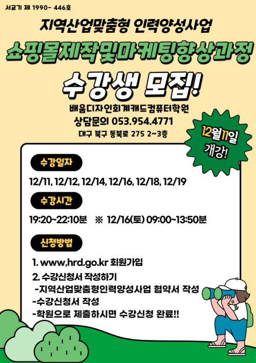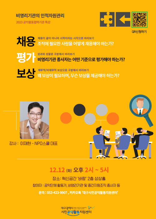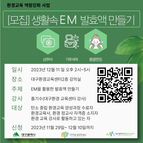현재 모집 중 검색폼 대구광역시는 해당 페이지를 정보제공을 위한 목적으로 플랫폼을 운영하며, 각 게시글의 내용 및 운영방침에 대한 책임을 지지 않습니다. 대구광역시청년센터 사업 모아보기 전체보기 분야 : 전체 지원사업 채용/인턴/알바 기자단/서포터즈/자원봉사 공모전 교육/강연/토론 축제/공연/전시 커뮤니티활동 기타 정렬 : 전체 신규등록순 모집마감순 상태 : 전체 진행중 종료 기간 설정 검색 검색어 입력 꿀정보등록 누구나 쉽고 빠르게 청년정보를 등록하여 홍보할 수 있습니다. 전체선택 종료 2023년 제2차 서구 청년 미래플랜 아카데미 개최(유튜버 이연 초청) 대구광역시 서구청 교육청소년과 ~ 2023.12.12 대구광역시청년센터 종료 [접수마감] 메리 농구마스! 대구 페가수스 농구단 무료티켓 이벤트 대구광역시청년센터 ~ 2023.12.11 종료 k-디지털플랫폼 DDD[Daegu Developer Day] 컨퍼런스 대구디지털혁신진흥원 ~ 2023.12.11 종료 대구 남구 토탈뷰티산업 창업 아이디어 공모전 키핑클래스 ~ 2023.12.11 종료 [특강]비영리기관의 인적자원 관리-채용,평가,보상에 대해 대구시민공익활동지원센터 ~ 2023.12.11 종료 쇼핑몰 제작 및 마케팅 향상과정 배움디자인회계캐트컴퓨터학원 ~ 2023.12.10 종료 생활속 EM발효액 만들기 참가자 모집 대구광역시환경교육센터 ~ 2023.12.10 종료 [굿네이버스] 취준생 인성 역량강화 자격증 과정 3기 참여자 모집 굿네이버스 ~ 2023.12.10 401 402 403 404 405 406 407 408 409 410