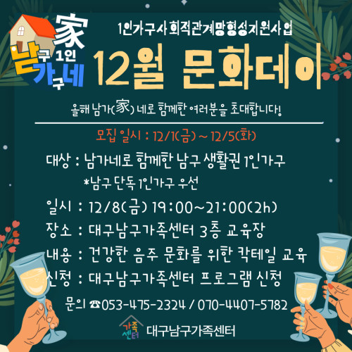 현재 모집 중 검색폼 대구광역시는 해당 페이지를 정보제공을 위한 목적으로 플랫폼을 운영하며, 각 게시글의 내용 및 운영방침에 대한 책임을 지지 않습니다. 대구광역시청년센터 사업 모아보기 전체보기 분야 : 전체 지원사업 채용/인턴/알바 기자단/서포터즈/자원봉사 공모전 교육/강연/토론 축제/공연/전시 커뮤니티활동 기타 정렬 : 전체 신규등록순 모집마감순 상태 : 전체 진행중 종료 기간 설정 검색 검색어 입력 꿀정보등록 누구나 쉽고 빠르게 청년정보를 등록하여 홍보할 수 있습니다. 전체선택 대구광역시청년센터 종료 취업은 기세다 대구광역시청년센터 ~ 2023.12.07 종료 <2023 경북대학교 지역사회공헌센터 ESG포럼> Beyond National ESG, towards Local ESG 더컴퍼니씨협동조합 ~ 2023.12.07 종료 기본소득대구네트워크x책빵고스란히 독서모임 기본소득대구네트워크x책빵고스란히 ~ 2023.12.07 종료 [대구남구가족센터] 문화데이 참여자 모집(홈바텐딩) 대구남구가족센터 ~ 2023.12.06 대구광역시청년센터 종료 2023 청년마음돌봄사업 [힐링프로그램 시즌4] 참여자 모집 대구광역시청년센터 ~ 2023.12.06 종료 "환경교육선진지"견학 참가자 모집 대구환경교육센터 ~ 2023.12.05 종료 우리들의 진솔한 웨딩톡톡 달서구청 여성가족과 ~ 2023.12.05 종료 (재공지)"환경교육선진지"견학 참가자 모집 대구환경교육센터 ~ 2023.12.04 411 412 413 414 415 416 417 418 419 420