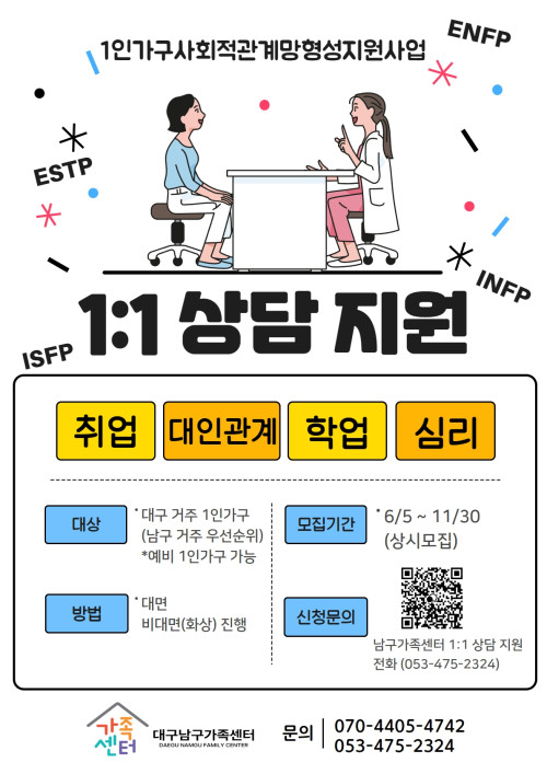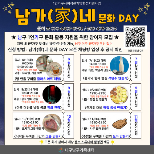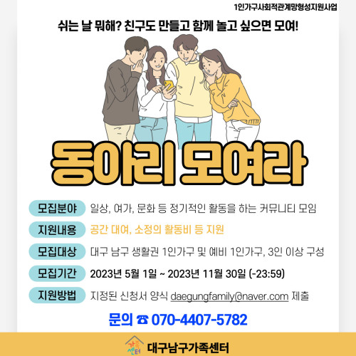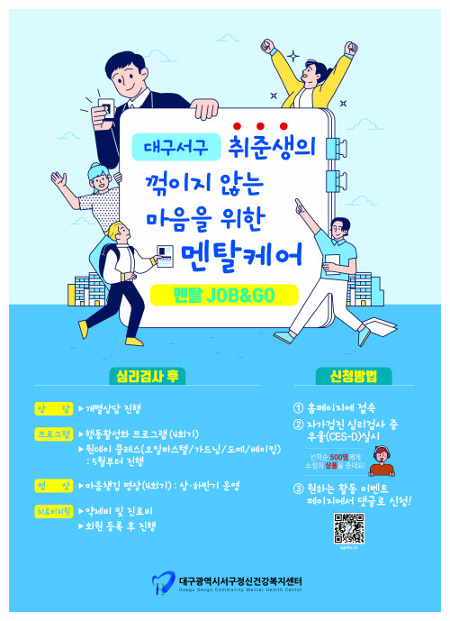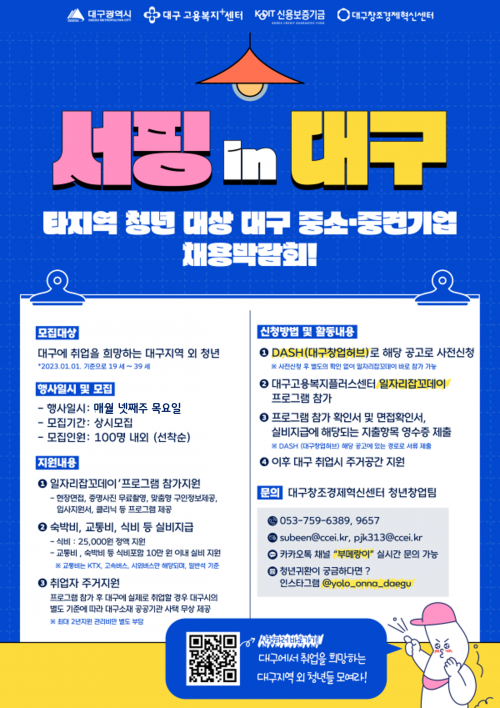 현재 모집 중 검색폼 대구광역시는 해당 페이지를 정보제공을 위한 목적으로 플랫폼을 운영하며, 각 게시글의 내용 및 운영방침에 대한 책임을 지지 않습니다. 대구광역시청년센터 사업 모아보기 전체보기 분야 : 전체 지원사업 채용/인턴/알바 기자단/서포터즈/자원봉사 공모전 교육/강연/토론 축제/공연/전시 커뮤니티활동 기타 정렬 : 전체 신규등록순 모집마감순 상태 : 전체 진행중 종료 기간 설정 검색 검색어 입력 꿀정보등록 누구나 쉽고 빠르게 청년정보를 등록하여 홍보할 수 있습니다. 전체선택 종료 1인가구 1:1 상담지원! 대구남구가족센터 ~ 2023.11.30 종료 남(家)네 문화 DAY 대구남구가족센터 ~ 2023.11.30 종료 수성구청년센터 청년다드림옷장 수성구청년센터 ~ 2023.11.30 종료 [ONE(원)하는대로!]동아리원 모집 대구남구가족센터 ~ 2023.11.30 종료 2023 취업 지원 프로그램 <서핑 in 대구> 참가자 모집 대구창조경제혁신센터 ~ 2023.11.30 종료 청년생활 종합상담 달서구 청년센터 ~ 2023.11.30 종료 대구 서구 취업준비생을 위한 멘탈잡고(JOB&GO) 대구광역시서구정신건강복지센터 ~ 2023.11.30 종료 수성알파시티 제5회 파워풀포럼 협동조합소이랩 ~ 2023.11.29 411 412 413 414 415 416 417 418 419 420