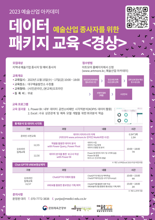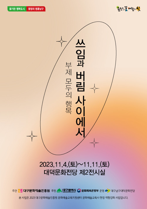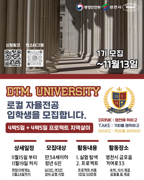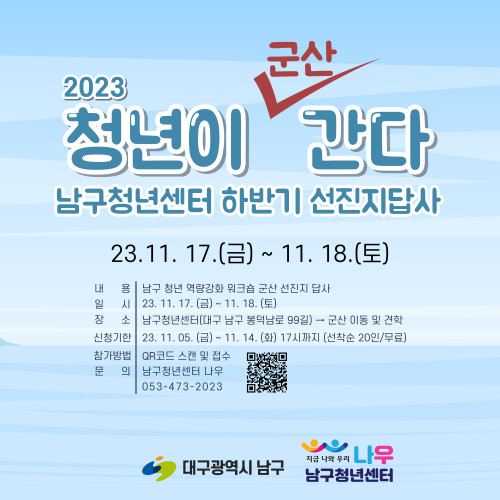 현재 모집 중 검색폼 대구광역시는 해당 페이지를 정보제공을 위한 목적으로 플랫폼을 운영하며, 각 게시글의 내용 및 운영방침에 대한 책임을 지지 않습니다. 대구광역시청년센터 사업 모아보기 전체보기 분야 : 전체 지원사업 채용/인턴/알바 기자단/서포터즈/자원봉사 공모전 교육/강연/토론 축제/공연/전시 커뮤니티활동 기타 정렬 : 전체 신규등록순 모집마감순 상태 : 전체 진행중 종료 기간 설정 검색 검색어 입력 꿀정보등록 누구나 쉽고 빠르게 청년정보를 등록하여 홍보할 수 있습니다. 전체선택 종료 2023 남구청년센터 하반기 선진지답사 남구청년센터 ~ 2023.11.14 종료 [레벨제로 프로젝트] 방과 후 송라이팅 클럽 참가 신청 모집 (~ 11.14까지) 청소년문화의집 꼼지락발전소 ~ 2023.11.14 종료 데이터 패키지 (무료) 교육생 선착순 모집 문화체육관광부 ~ 2023.11.14 종료 DTM. UNIVERSITY 로컬 자율전공생 모집 행정안전부 / 영천 취하리 ~ 2023.11.13 종료 [자립역량강화워크숍] 훌라 안진나 대표님의 액셀과 브레이크는? 커뮤니티디자인 내마음은 콩밭 협동조합 ~ 2023.11.13 종료 2023 대구광역시 찾아가는 환경교육 대구광역시환경교육센터 ~ 2023.11.13 종료 [영천은 말이야] 1박2일 듀얼라이프 영천살아보기 캠프 신청자 모집 영천청년센터, 메세지팩토리협동조합 ~ 2023.11.12 종료 쓰임과 버림사이에서 전시(부제: 모두의 행복) 대덕문화전당 ~ 2023.11.11 421 422 423 424 425 426 427 428 429 430