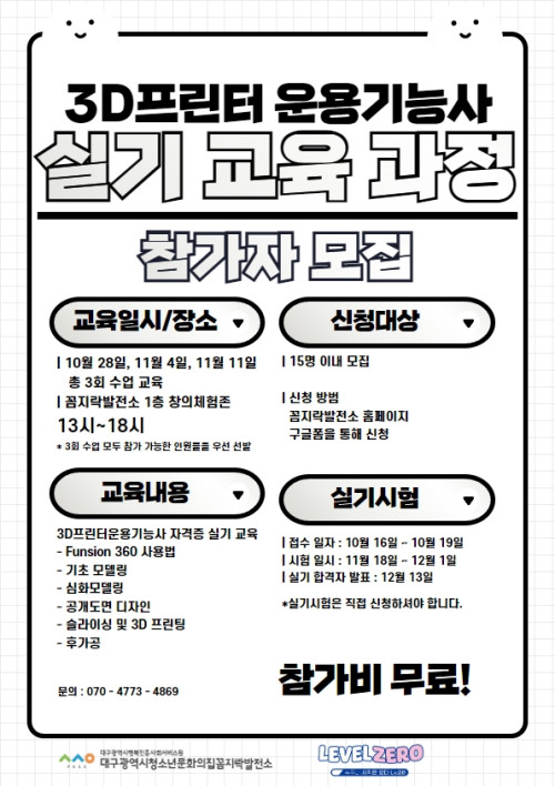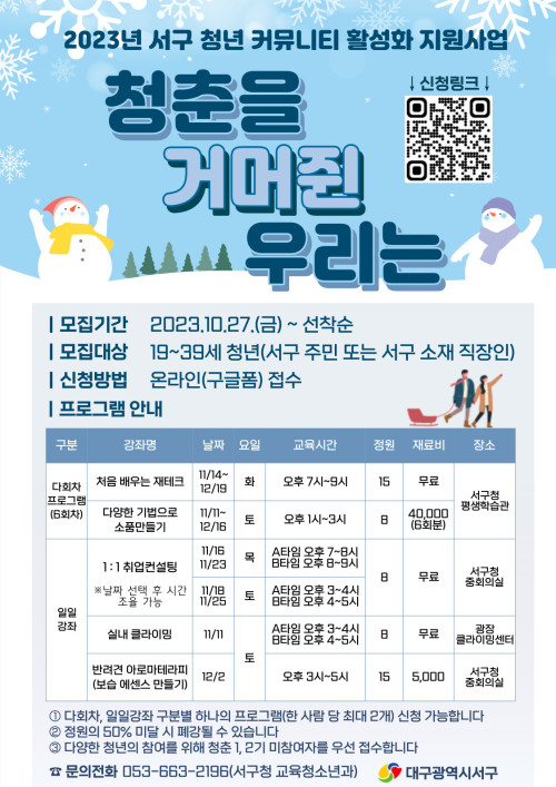 현재 모집 중 검색폼 대구광역시는 해당 페이지를 정보제공을 위한 목적으로 플랫폼을 운영하며, 각 게시글의 내용 및 운영방침에 대한 책임을 지지 않습니다. 대구광역시청년센터 사업 모아보기 전체보기 분야 : 전체 지원사업 채용/인턴/알바 기자단/서포터즈/자원봉사 공모전 교육/강연/토론 축제/공연/전시 커뮤니티활동 기타 정렬 : 전체 신규등록순 모집마감순 상태 : 전체 진행중 종료 기간 설정 검색 검색어 입력 꿀정보등록 누구나 쉽고 빠르게 청년정보를 등록하여 홍보할 수 있습니다. 전체선택 종료 『망설이는 사랑』 저자 안희제 북토크 책방이층 ~ 2023.11.11 종료 만19세-39세 원데이클래스 참여자 모집 월성종합사회복지관 ~ 2023.11.10 종료 오픈 세미나 참가자 모집 (~11/10) 대구경북지역혁신플랫폼 전자정보기기사업단 ~ 2023.11.10 종료 남구청년오락실<청춘다짐> 에서 그룹 PT 참여자를 모집 합니다. 남구청년센터 ~ 2023.11.10 종료 [청춘을 거머쥔 우리는 3기] 1:1 취업컨설팅 대구광역시 서구청 교육청소년과 ~ 2023.11.10 종료 [서구 청년 커뮤니티 활성화] 청춘을 거머쥔 우리는 3기 모집! 대구광역시 서구청 교육청소년과 ~ 2023.11.10 종료 3D프린터운용기능사 실기 교육 과정 모집 꼼지락발전소 ~ 2023.11.10 종료 [자립역량키우기] 표현예술치료를 연구하는 정주원님의 액셀과 브레이크는? 커뮤니티디자인 내마음은 콩밭 협동조합 ~ 2023.11.10 421 422 423 424 425 426 427 428 429 430