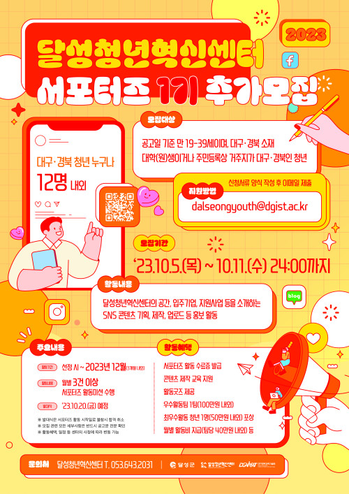 현재 모집 중 검색폼 대구광역시는 해당 페이지를 정보제공을 위한 목적으로 플랫폼을 운영하며, 각 게시글의 내용 및 운영방침에 대한 책임을 지지 않습니다. 대구광역시청년센터 사업 모아보기 전체보기 분야 : 전체 지원사업 채용/인턴/알바 기자단/서포터즈/자원봉사 공모전 교육/강연/토론 축제/공연/전시 커뮤니티활동 기타 정렬 : 전체 신규등록순 모집마감순 상태 : 전체 진행중 종료 기간 설정 검색 검색어 입력 꿀정보등록 누구나 쉽고 빠르게 청년정보를 등록하여 홍보할 수 있습니다. 전체선택 종료 2023 청년도전지원사업 젊핑 <도전> 시즌6 참여자 모집 대구시청년센터 ~ 2023.10.13 종료 <책으로 이어진 우리> 독서모임 아무의 방 ~ 2023.10.13 종료 제17회 대구자원봉사박람회 ! "지구를 살리는 걸음기부자 사전 모집 대구광역시자원봉사센터 ~ 2023.10.12 종료 투디엔드 그린피스 ~ 2023.10.12 종료 2023년 달성청년혁신센터 서포터즈 1기 추가모집 공고 대구경북과학기술원 ~ 2023.10.11 종료 2023년 달서구 청년창업지원센터「달서구 청년창업 벌크업 아이디어톤 경진대회」 모 달서구 청년창업지원센터 ~ 2023.10.11 대구광역시청년센터 종료 2023 청년활력공간 다온나그래 하반기 공간운영단 추가 모집 대구광역시청년센터 ~ 2023.10.11 종료 All In One 취업아카데미 - 토크콘서트(6차) - (주)티웨이항공 & (주)경창산업 (주)클라인 ~ 2023.10.10 441 442 443 444 445 446 447 448 449 450