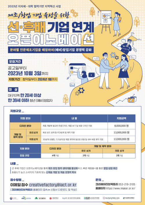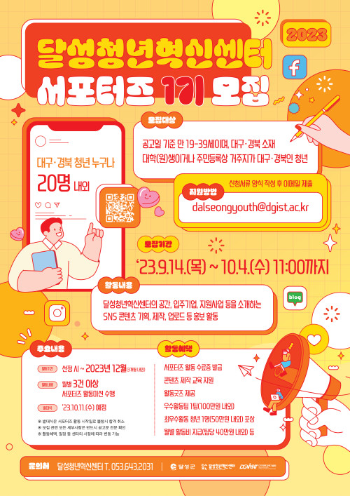 현재 모집 중 검색폼 대구광역시는 해당 페이지를 정보제공을 위한 목적으로 플랫폼을 운영하며, 각 게시글의 내용 및 운영방침에 대한 책임을 지지 않습니다. 대구광역시청년센터 사업 모아보기 전체보기 분야 : 전체 지원사업 채용/인턴/알바 기자단/서포터즈/자원봉사 공모전 교육/강연/토론 축제/공연/전시 커뮤니티활동 기타 정렬 : 전체 신규등록순 모집마감순 상태 : 전체 진행중 종료 기간 설정 검색 검색어 입력 꿀정보등록 누구나 쉽고 빠르게 청년정보를 등록하여 홍보할 수 있습니다. 전체선택 종료 머그컵 프레스기를 이용한 나만의 머그컵 만들기 (재)대구테크노파크 스타트라인 ~ 2023.10.05 종료 청년농사왕이 궁금해? 2023 찾아가는 현장 설명회 농림축산식품부 ~ 2023.10.04 종료 슬기로운 자취학교 (주)뷰티인사이드 ~ 2023.10.04 종료 [사회연대은행] 사회적경제 취,창업 활성화 교육 "사회적경제기업가 특강" 진행 (사)함께만드는세상 사회연대은행 ~ 2023.10.04 종료 2023년 달성청년혁신센터 서포터즈 1기 모집 달성청년혁신센터 ~ 2023.10.04 종료 [모집중]2023온라인역량강화교육사업 <공익특강> 대구시민공익활동지원센터 ~ 2023.10.04 종료 2023 미디어교육 강사 전문(자격증) 과정 수강생 모집 시청자미디어재단 ~ 2023.10.03 종료 선·후배 기업 연계 오픈 이노베이션 참가 기업 모집 (~10/3) 대구경북지역혁신플랫폼 전자정보기기사업단 ~ 2023.10.03 441 442 443 444 445 446 447 448 449 450