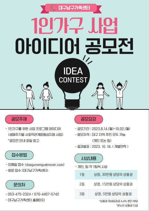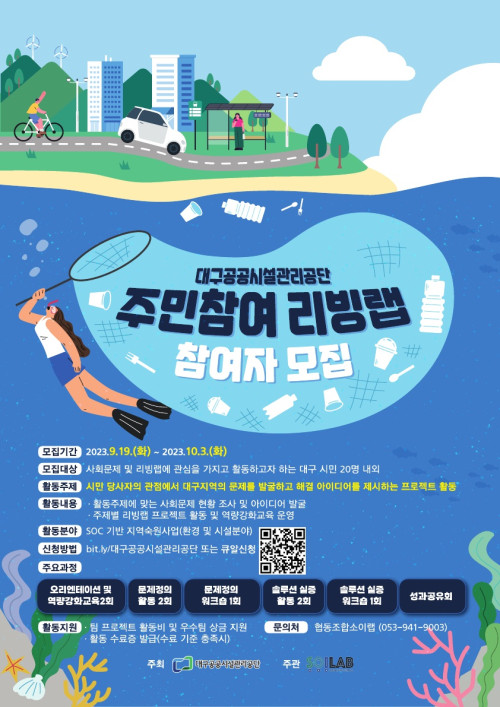 현재 모집 중 검색폼 대구광역시는 해당 페이지를 정보제공을 위한 목적으로 플랫폼을 운영하며, 각 게시글의 내용 및 운영방침에 대한 책임을 지지 않습니다. 대구광역시청년센터 사업 모아보기 전체보기 분야 : 전체 지원사업 채용/인턴/알바 기자단/서포터즈/자원봉사 공모전 교육/강연/토론 축제/공연/전시 커뮤니티활동 기타 정렬 : 전체 신규등록순 모집마감순 상태 : 전체 진행중 종료 기간 설정 검색 검색어 입력 꿀정보등록 누구나 쉽고 빠르게 청년정보를 등록하여 홍보할 수 있습니다. 전체선택 종료 [대구공공시설관리공단] 주민참여 리빙랩 협동조합소이랩 ~ 2023.10.03 종료 2023 소잉 디자이너 패션공방 창업인큐베이팅 사업 달구벌여성인력개발센터 ~ 2023.10.03 종료 2023 신속 제품제작지원 3차 모집공고 (재)대구테크노파크 스타트라인 ~ 2023.10.03 종료 [파괴왕] 화면해설 대본작성 워크숍 파괴왕 ~ 2023.10.03 종료 <2023 로컬의 발견> C.STATION⭐️체류형-자유 프로젝트 참여자 모집 중⭐️ 행정안전부, 밀양소통협력센터, 더컴퍼니씨협동조합 ~ 2023.10.03 종료 가족구성권, 새로운 삶을 상상하다! 릴레이 강연회 대구경북차별금지법제정연대 ~ 2023.10.03 종료 청도 로컬트래블러 시즌2 더컴퍼니씨협동조합 ~ 2023.10.03 종료 2023 1인가구 사업 아이디어 공모전 대구남구가족센터 ~ 2023.10.02 441 442 443 444 445 446 447 448 449 450