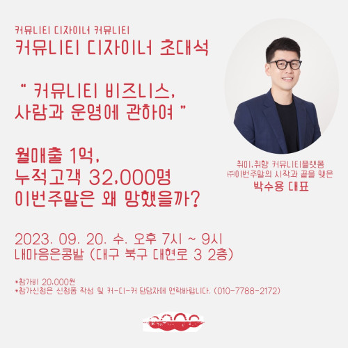 현재 모집 중 검색폼 대구광역시는 해당 페이지를 정보제공을 위한 목적으로 플랫폼을 운영하며, 각 게시글의 내용 및 운영방침에 대한 책임을 지지 않습니다. 대구광역시청년센터 사업 모아보기 전체보기 분야 : 전체 지원사업 채용/인턴/알바 기자단/서포터즈/자원봉사 공모전 교육/강연/토론 축제/공연/전시 커뮤니티활동 기타 정렬 : 전체 신규등록순 모집마감순 상태 : 전체 진행중 종료 기간 설정 검색 검색어 입력 꿀정보등록 누구나 쉽고 빠르게 청년정보를 등록하여 홍보할 수 있습니다. 전체선택 종료 923 기후정의행진 대구참가단 모집 (9/23) 대구기후위기비상행동 ~ 2023.09.21 종료 '헤이그 특사 이준과 아브라함 카이퍼의 만남' 저자와 함께하는 랜선 책모임 세모람 ~ 2023.09.21 종료 커뮤니티-디자이너-커뮤니티 <이번주말, 박수용 대표> 커뮤니티디자인 내마음은 콩밭 협동조합 ~ 2023.09.20 종료 2023 대구 그린라이프 페스타 참가기업 모집 (사)커뮤니티와경제 ~ 2023.09.20 종료 흐려져 선명해지는 것들: 홍진훤 작가와의 대화・<멜팅 아이스크림> 상영 낫온리북스 ~ 2023.09.20 종료 [수성구자원봉사센터] '올랑올랑' - 찾아가는 플로깅 3탄! 수성구자원봉사센터 ~ 2023.09.20 종료 🎞️주말의 명화 - 🎥500일의 썸머 남구청년센터 ~ 2023.09.20 종료 생장 LED를 활용한 가정용 반려식물 키움도구 제작 (재)대구테크노파크 스타트라인 ~ 2023.09.20 451 452 453 454 455 456 457 458 459 460