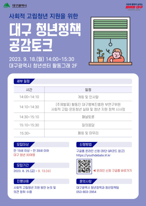 현재 모집 중 검색폼 대구광역시는 해당 페이지를 정보제공을 위한 목적으로 플랫폼을 운영하며, 각 게시글의 내용 및 운영방침에 대한 책임을 지지 않습니다. 대구광역시청년센터 사업 모아보기 전체보기 분야 : 전체 지원사업 채용/인턴/알바 기자단/서포터즈/자원봉사 공모전 교육/강연/토론 축제/공연/전시 커뮤니티활동 기타 정렬 : 전체 신규등록순 모집마감순 상태 : 전체 진행중 종료 기간 설정 검색 검색어 입력 꿀정보등록 누구나 쉽고 빠르게 청년정보를 등록하여 홍보할 수 있습니다. 전체선택 종료 미스터두낫띵 초청 특강 달서구 청년창업지원센터 ~ 2023.09.13 종료 3D프린터로 만드는 식물 생장 조명등 제작 교육 (재)대구테크노파크 스타트라인 ~ 2023.09.13 종료 사회적 고립청년 지원을 위한 「대구 청년정책 공감토크」 참여자 모집 대구광역시청 청년정책과 ~ 2023.09.13 종료 [대구여성영화제] - "젠더시네마스쿨" 수강생 모집 계명대학교 여성학연구소 대구여성영화제 사무국 ~ 2023.09.13 종료 '요즘 팀장의 오답 노트' 저자와 함께하는 랜선 책모임 세모람 ~ 2023.09.13 종료 대표님이 들려주는 취창업 이야기 ep.3 대구동구사회적경제협의회 ~ 2023.09.12 종료 MBTI 지피지기 집단상담 참여자 모집 월성종합사회복지관 ~ 2023.09.12 종료 <2023 경북대학교 지역사회공헌센터 ESG포럼> ESG로 성장하는 지역사회 네트워크 더컴퍼니씨협동조합 ~ 2023.09.12 451 452 453 454 455 456 457 458 459 460