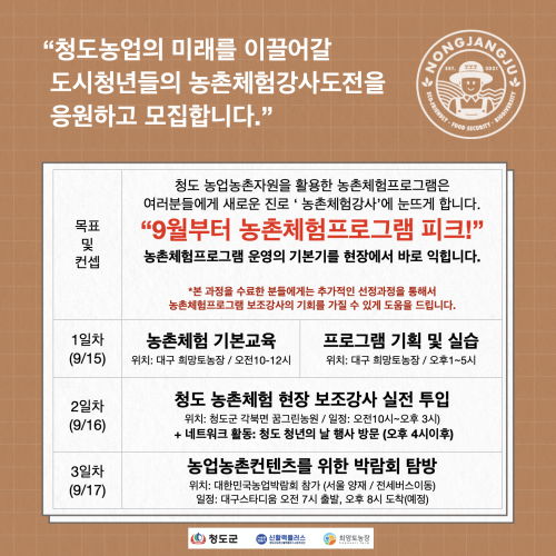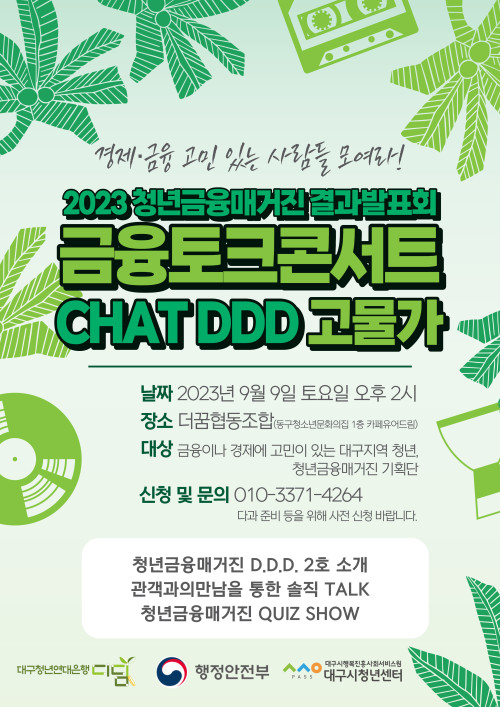 현재 모집 중 검색폼 대구광역시는 해당 페이지를 정보제공을 위한 목적으로 플랫폼을 운영하며, 각 게시글의 내용 및 운영방침에 대한 책임을 지지 않습니다. 대구광역시청년센터 사업 모아보기 전체보기 분야 : 전체 지원사업 채용/인턴/알바 기자단/서포터즈/자원봉사 공모전 교육/강연/토론 축제/공연/전시 커뮤니티활동 기타 정렬 : 전체 신규등록순 모집마감순 상태 : 전체 진행중 종료 기간 설정 검색 검색어 입력 꿀정보등록 누구나 쉽고 빠르게 청년정보를 등록하여 홍보할 수 있습니다. 전체선택 종료 Mbot으로 배우는 자율주행 (재)대구테크노파크 스타트라인 ~ 2023.09.11 종료 수성구청년축제 리그램 이벤트 수성구청년센터 ~ 2023.09.10 종료 생태와 함께하는 투잡의 정점!! 농촌체험강사 어때요? 청년농장주 파밍랩 9월모집 농업회사법인 희망토 주식회사 ~ 2023.09.10 종료 [인터뷰 참여자 모집] 지역 청년 '일경험 사업' 경험 인터뷰 참여자 모집 대구청년유니온 ~ 2023.09.09 종료 사진가 김재연 아티스트 토크・전시 낫온리북스 ~ 2023.09.09 종료 2023 하반기 달성습지 자연학교 대구환경교육센터 ~ 2023.09.09 대구광역시청년센터 종료 2023 면접비 지원사업 신청 마감 대구광역시 청년센터 ~ 2023.09.08 종료 2023 청년금융매거진 금융토크콘서트 CHAT D.D.D 대구청년연대은행디딤 ~ 2023.09.08 451 452 453 454 455 456 457 458 459 460