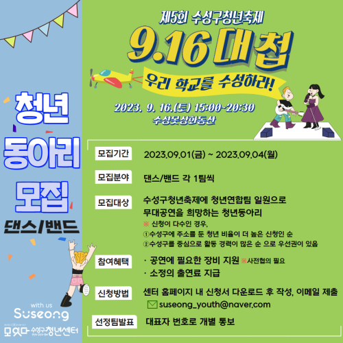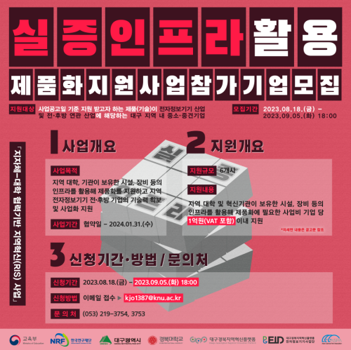 현재 모집 중 검색폼 대구광역시는 해당 페이지를 정보제공을 위한 목적으로 플랫폼을 운영하며, 각 게시글의 내용 및 운영방침에 대한 책임을 지지 않습니다. 대구광역시청년센터 사업 모아보기 전체보기 분야 : 전체 지원사업 채용/인턴/알바 기자단/서포터즈/자원봉사 공모전 교육/강연/토론 축제/공연/전시 커뮤니티활동 기타 정렬 : 전체 신규등록순 모집마감순 상태 : 전체 진행중 종료 기간 설정 검색 검색어 입력 꿀정보등록 누구나 쉽고 빠르게 청년정보를 등록하여 홍보할 수 있습니다. 전체선택 종료 CES 2024 경북대 RIS 공동관 참가 기업 모집 (~9/5) 대구경북지역혁신플랫폼 전자정보기기사업단 ~ 2023.09.05 종료 실증인프라 활용 제품화 지원 사업 참가 기업 모집 (~9/5) 대구경북지역혁신플랫폼 전자정보기기사업단 ~ 2023.09.05 종료 달서구 청년센터 D-청년 아카데미 이모티콘 작가 양성과정 모집 달서구 청년센터 ~ 2023.09.05 종료 제5회 수성구청년축제 청년 동아리 모집 수성구청년센터 ~ 2023.09.04 종료 시네마 동구 : 드라마와 영화를 통해 사회적경제를 알아보는 시간 ep.2 대구동구사회적경제협의회 ~ 2023.09.04 종료 <오늘의 호작질> 미니북 만들기 아무의 방 ~ 2023.09.04 종료 커뮤니티 리빙랩 참여자 모집 협동조합 소이랩 ~ 2023.09.03 종료 [2023년] ★ [8월 23일 신청마감] ★ 제주 로컬 청년 창업캠프, ‘슬기로운 로컬생활’ 참가자 모집 (청년후계농 선택교육 100시간 인정 교육과정) 글로벌제주문화협동조합 & 버킷 ~ 2023.09.03 461 462 463 464 465 466 467 468 469 470