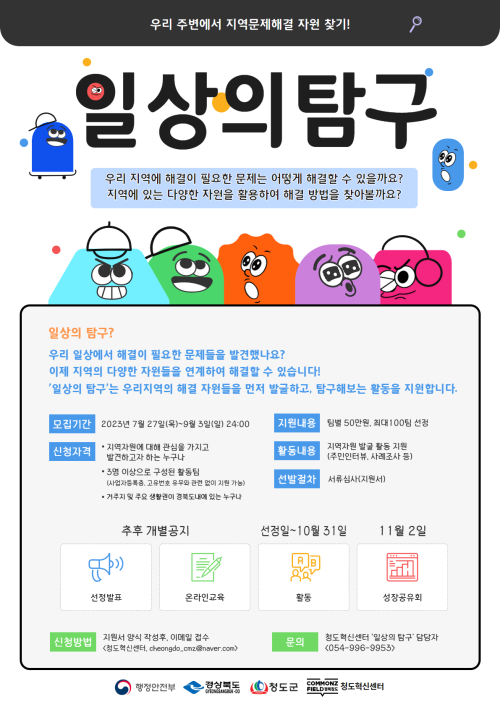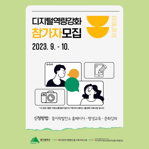 현재 모집 중 검색폼 대구광역시는 해당 페이지를 정보제공을 위한 목적으로 플랫폼을 운영하며, 각 게시글의 내용 및 운영방침에 대한 책임을 지지 않습니다. 대구광역시청년센터 사업 모아보기 전체보기 분야 : 전체 지원사업 채용/인턴/알바 기자단/서포터즈/자원봉사 공모전 교육/강연/토론 축제/공연/전시 커뮤니티활동 기타 정렬 : 전체 신규등록순 모집마감순 상태 : 전체 진행중 종료 기간 설정 검색 검색어 입력 꿀정보등록 누구나 쉽고 빠르게 청년정보를 등록하여 홍보할 수 있습니다. 전체선택 종료 [수창 PAN_2.Locality] 우리는 왜 지역성에 집중하는가 로컬익스프레스 대구 ~ 2023.09.03 종료 [일상의 실험🧪] 우리가 살아가고 있는 지역에서 생활 실험해보기 청도혁신센터 ~ 2023.09.03 종료 [일상의 탐구🔎] 경상북도 지역의 자원을 찾는 활동 지원 해드려요~! 청도혁신센터 ~ 2023.09.03 종료 디지털역량강화 프로그램 9-10월 참가자 모집 대구광역시청소년문화의집 꼼지락발전소 ~ 2023.09.02 종료 [책쓰는일요일] 프로작가가 책 출간을 도와드려요 나를위함 ~ 2023.09.02 종료 [독서모임] 알아두면 쓸데있는 인문학클럽 나를위함 ~ 2023.09.02 종료 독립출판 체험 [매거진 꼼지] 대구광역시청소년문화의집 꼼지락발전소 ~ 2023.09.02 종료 '10년 차 IT 기획자의 노트 ' 저자와 함께하는 랜선 책모임 세모람 ~ 2023.09.02 461 462 463 464 465 466 467 468 469 470