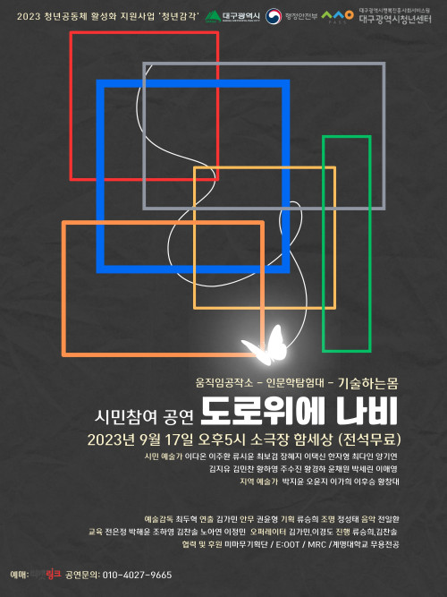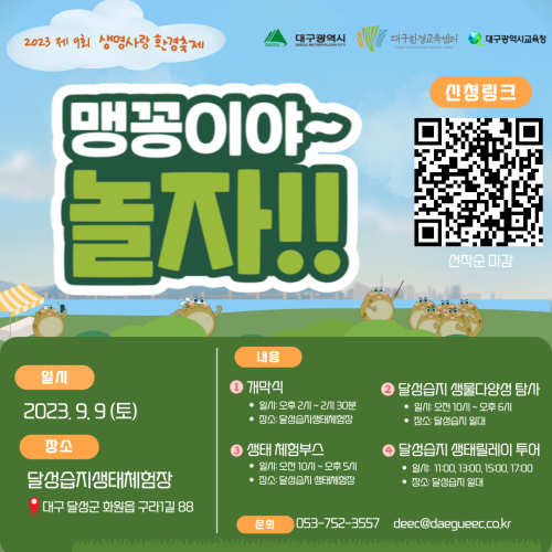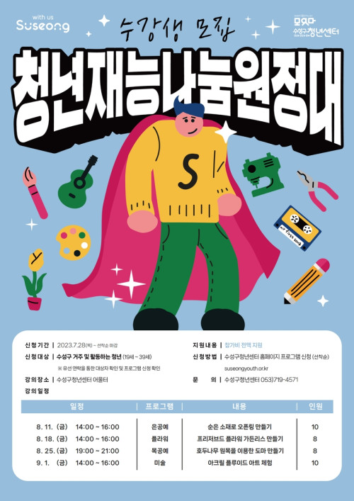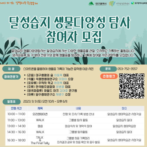 현재 모집 중 검색폼 대구광역시는 해당 페이지를 정보제공을 위한 목적으로 플랫폼을 운영하며, 각 게시글의 내용 및 운영방침에 대한 책임을 지지 않습니다. 대구광역시청년센터 사업 모아보기 전체보기 분야 : 전체 지원사업 채용/인턴/알바 기자단/서포터즈/자원봉사 공모전 교육/강연/토론 축제/공연/전시 커뮤니티활동 기타 정렬 : 전체 신규등록순 모집마감순 상태 : 전체 진행중 종료 기간 설정 검색 검색어 입력 꿀정보등록 누구나 쉽고 빠르게 청년정보를 등록하여 홍보할 수 있습니다. 전체선택 종료 제2회 대구N맥페스티벌 참여자 모집 대구N맥페스티벌 기획단 ~ 2023.09.02 종료 기술하는몸-시민참여공연< 도로위에 나비> 청년공동체활성화사업/무궁무진무용단 ~ 2023.09.01 종료 2023 달성습지 생물다양성 탐사 대구환경교육센터 ~ 2023.09.01 종료 청년 글로벌 개척단(스페인) 참가 학생 모집 (~9/1) 대구경북지역혁신플랫폼 전자정보기기사업단 ~ 2023.09.01 종료 2023 제 9회 맹꽁이축제 대구환경교육센터 ~ 2023.09.01 종료 수성구청년센터 8월 청년재능나눔원정대 모집 수성구청년센터 ~ 2023.09.01 종료 남구청년오락실<청춘다짐> 에서 그룹 PT 참여자를 모집 합니다. 남구청년센터 ~ 2023.08.31 종료 [두다닷] 2023년 두다닷 하반기 신입부원 모집 두다닷 ~ 2023.08.31 461 462 463 464 465 466 467 468 469 470
