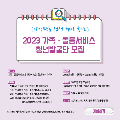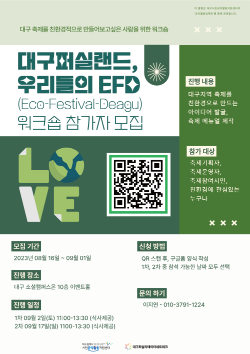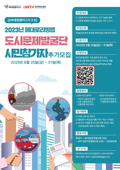 현재 모집 중 검색폼 대구광역시는 해당 페이지를 정보제공을 위한 목적으로 플랫폼을 운영하며, 각 게시글의 내용 및 운영방침에 대한 책임을 지지 않습니다. 대구광역시청년센터 사업 모아보기 전체보기 분야 : 전체 지원사업 채용/인턴/알바 기자단/서포터즈/자원봉사 공모전 교육/강연/토론 축제/공연/전시 커뮤니티활동 기타 정렬 : 전체 신규등록순 모집마감순 상태 : 전체 진행중 종료 기간 설정 검색 검색어 입력 꿀정보등록 누구나 쉽고 빠르게 청년정보를 등록하여 홍보할 수 있습니다. 전체선택 종료 [SW융합클러스터 2.0] 제대로리빙랩 도시문제발굴단 시민참가자 추가 모집 공고 (재)대구테크노파크 ~ 2023.08.31 종료 2023 가족ㆍ돌봄서비스 청년발굴단 모집 한국여성정책연구원 ~ 2023.08.31 종료 글쓰기 클럽 /유치찬란/ 9월 멤버 모집 아무의 방 ~ 2023.08.31 종료 2023년 RISE 아카데미_탐구모임 참가 학생 모집 (~8/31) 대구경북지역혁신플랫폼 전자정보기기사업단 ~ 2023.08.31 종료 친환경축제 만들기 워크숍 참여자 모집 대구퍼실랜드 ~ 2023.08.31 종료 청년지원사업 <함께 그리는 항해지도> 참가자 모집 범물종합사회복지관 ~ 2023.08.31 종료 대구독서모임 '나를위함' 가을시즌 오픈 나를위함 ~ 2023.08.31 종료 달성노을공원에서 즐기는 야외요가 날씨가 좋다면 만나요(Imagine-달성2000) ~ 2023.08.31 461 462 463 464 465 466 467 468 469 470