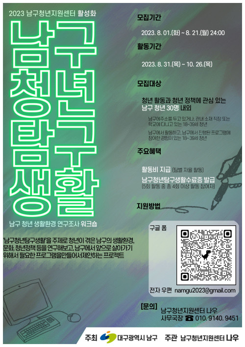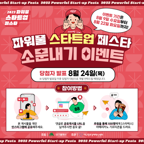현재 모집 중 검색폼 대구광역시는 해당 페이지를 정보제공을 위한 목적으로 플랫폼을 운영하며, 각 게시글의 내용 및 운영방침에 대한 책임을 지지 않습니다. 대구광역시청년센터 사업 모아보기 전체보기 분야 : 전체 지원사업 채용/인턴/알바 기자단/서포터즈/자원봉사 공모전 교육/강연/토론 축제/공연/전시 커뮤니티활동 기타 정렬 : 전체 신규등록순 모집마감순 상태 : 전체 진행중 종료 기간 설정 검색 검색어 입력 꿀정보등록 누구나 쉽고 빠르게 청년정보를 등록하여 홍보할 수 있습니다. 전체선택 종료 2023 파워풀 스타트업 페스타 소문내기 이벤트 대구창조경제혁신센터 ~ 2023.08.22 대구광역시청년센터 종료 대구광역시청년센터 여름맞이 굿즈 증정 EVENT 대구광역시청년센터 ~ 2023.08.22 종료 [SW융합클러스터 2.0] 제대로리빙랩 도시문제발굴단 시민참가자 모집 공고 (재)대구테크노파크 ~ 2023.08.22 종료 '앰비언트 - 포스트 스마트폰 시대에 대비하라' 저자와 함께하는 랜선 책모임 세모람 ~ 2023.08.22 종료 2023 Good Job 온라인 취업캠프 참가자 모집 고용노동부, 한국공학대학교 대학일자리플러스센터 ~ 2023.08.22 종료 [남구청년탐구생활]남구청년센터 활성화 및 남구 청년 생활환경 연구조사 워크숍 나우 남구청년센터 ~ 2023.08.21 종료 황금동 게더링 : 8월 커뮤니티 시네마 황금동 작업실 ~ 2023.08.21 대구광역시청년센터 종료 2023 청년마음돌봄사업 [심화상담 시즌3] 참여자 모집 대구광역시청년센터 ~ 2023.08.20 471 472 473 474 475 476 477 478 479 480