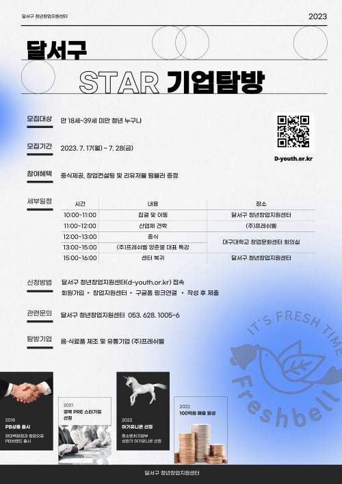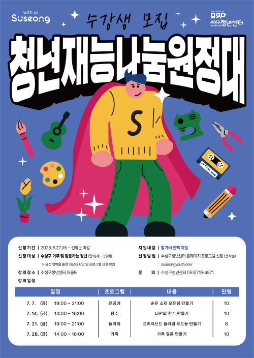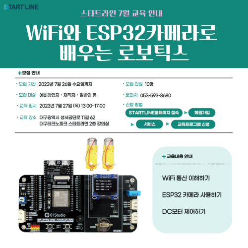 현재 모집 중 검색폼 대구광역시는 해당 페이지를 정보제공을 위한 목적으로 플랫폼을 운영하며, 각 게시글의 내용 및 운영방침에 대한 책임을 지지 않습니다. 대구광역시청년센터 사업 모아보기 전체보기 분야 : 전체 지원사업 채용/인턴/알바 기자단/서포터즈/자원봉사 공모전 교육/강연/토론 축제/공연/전시 커뮤니티활동 기타 정렬 : 전체 신규등록순 모집마감순 상태 : 전체 진행중 종료 기간 설정 검색 검색어 입력 꿀정보등록 누구나 쉽고 빠르게 청년정보를 등록하여 홍보할 수 있습니다. 전체선택 종료 달서구 STAR 기업탐방 달서구 청년창업지원센터 ~ 2023.07.28 종료 수성구청년센터 7월 청년재능나눔원정대 모집 수성구청년센터 ~ 2023.07.28 종료 [이솔로몬 북토크] 대구 청년, 작가 이솔로몬을 만나는 시간 국채보상운동기념도서관(구.대구광역시립중앙도서관) ~ 2023.07.27 종료 [청년누구나] 성동구청년정책 IT해커톤 킹십리 ~ 2023.07.26 종료 2023년 해외일경험지원사업(WELL) 3차 참여 청년 모집 한국산업인력공단 ~ 2023.07.26 종료 WiFi와 ESP32 카메라로 배우는 로보틱스 (재)대구테크노파크 스타트라인 ~ 2023.07.26 종료 저자와 함께하는 랜선 책 모임 세모람도서관 ~ 2023.07.26 종료 시네마 동구 : 드라마와 영화를 통해 사회적경제를 알아보는 시간 ep.1 동구사회적경제협의회 ~ 2023.07.25 481 482 483 484 485 486 487 488 489 490