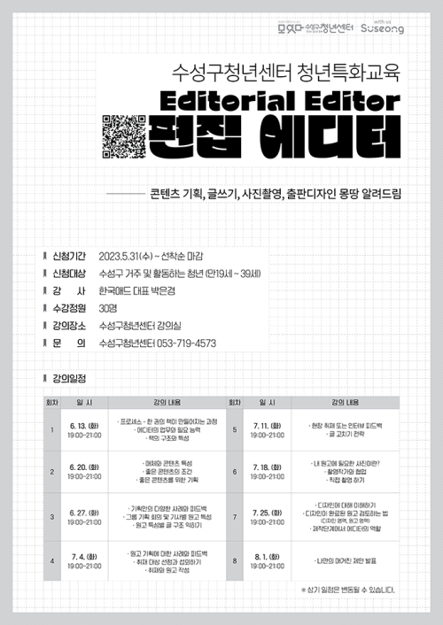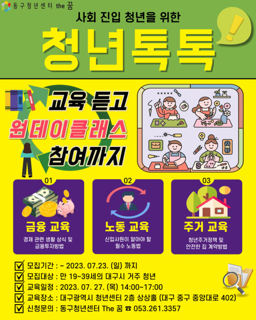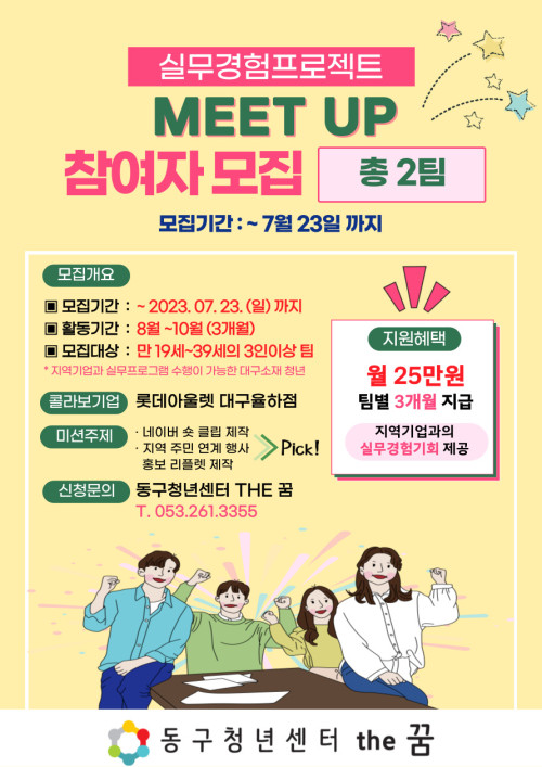 현재 모집 중 검색폼 대구광역시는 해당 페이지를 정보제공을 위한 목적으로 플랫폼을 운영하며, 각 게시글의 내용 및 운영방침에 대한 책임을 지지 않습니다. 대구광역시청년센터 사업 모아보기 전체보기 분야 : 전체 지원사업 채용/인턴/알바 기자단/서포터즈/자원봉사 공모전 교육/강연/토론 축제/공연/전시 커뮤니티활동 기타 정렬 : 전체 신규등록순 모집마감순 상태 : 전체 진행중 종료 기간 설정 검색 검색어 입력 꿀정보등록 누구나 쉽고 빠르게 청년정보를 등록하여 홍보할 수 있습니다. 전체선택 종료 수성구청년센터 청년특화교육 - 편집에디터 수성구청년센터 ~ 2023.07.25 종료 (1인가구지원-경제 교육 프로그램) 돈(Money) 워리~ 대구남구가족센터 ~ 2023.07.25 대구광역시청년센터 종료 2023 청년마음돌봄사업 [힐링프로그램 시즌2] 참여자 모집 대구광역시청년센터 ~ 2023.07.25 종료 2023 DYT 플리마켓 셀러모집 달서구 청년센터 ~ 2023.07.24 종료 대구 예비예술인 발굴육성지원사업 꿈꾸는씨어터(주) ~ 2023.07.24 종료 '다오 DAO' 이유미 저자와 함께하는 랜선 책모임 세모람도서관 ~ 2023.07.24 종료 2023 '청년톡톡' 참가자 모집 대구 동구청년센터 the꿈 ~ 2023.07.23 종료 청년실무경험지원 'MEET UP' 참가자 모집 대구 동구청년센터 the꿈 ~ 2023.07.23 481 482 483 484 485 486 487 488 489 490