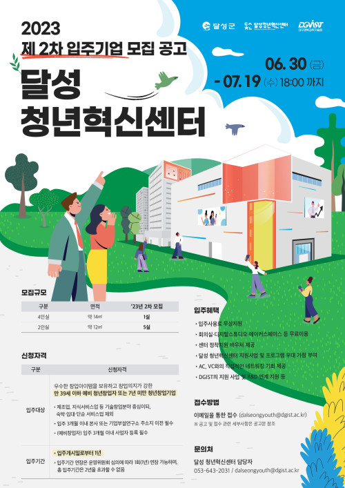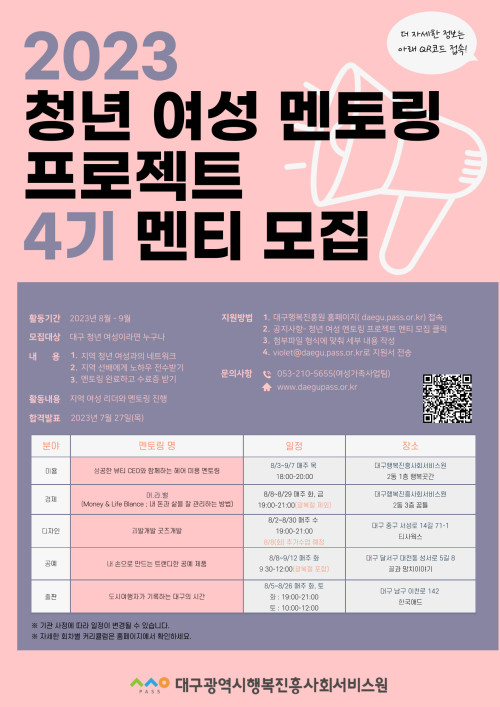 현재 모집 중 검색폼 대구광역시는 해당 페이지를 정보제공을 위한 목적으로 플랫폼을 운영하며, 각 게시글의 내용 및 운영방침에 대한 책임을 지지 않습니다. 대구광역시청년센터 사업 모아보기 전체보기 분야 : 전체 지원사업 채용/인턴/알바 기자단/서포터즈/자원봉사 공모전 교육/강연/토론 축제/공연/전시 커뮤니티활동 기타 정렬 : 전체 신규등록순 모집마감순 상태 : 전체 진행중 종료 기간 설정 검색 검색어 입력 꿀정보등록 누구나 쉽고 빠르게 청년정보를 등록하여 홍보할 수 있습니다. 전체선택 종료 <촌스러운 어른이날> 전시회 변주X쌍걸 ~ 2023.07.23 종료 2023 청년 여성 멘토링 프로젝트 멘티 모집 대구광역시행복진흥사회서비스원 ~ 2023.07.23 종료 환상문학 7~8월 여름 호러 금요독서모임 모집(마감) 환상문학 ~ 2023.07.23 종료 [심리검사] 정식! MBTI 성격유형검사 나를위함 ~ 2023.07.21 종료 ONEDAY CLASS - neon sign 달서구 청년센터 ~ 2023.07.20 종료 대표님이 들려주는 취창업 이야기 EP.1 대구동구사회적경제협의회 ~ 2023.07.19 종료 달성 청년혁신센터 2023년 제2차 입주기업 모집 공고 달성 청년혁신센터 ~ 2023.07.19 종료 [나의 자그마한 책] 출판 워크숍 아무의 방 ~ 2023.07.19 481 482 483 484 485 486 487 488 489 490