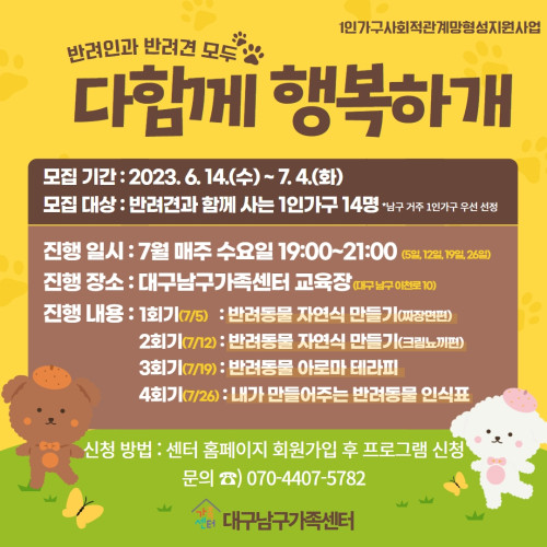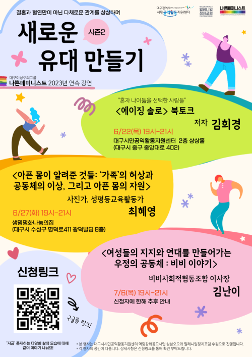 현재 모집 중 검색폼 대구광역시는 해당 페이지를 정보제공을 위한 목적으로 플랫폼을 운영하며, 각 게시글의 내용 및 운영방침에 대한 책임을 지지 않습니다. 대구광역시청년센터 사업 모아보기 전체보기 분야 : 전체 지원사업 채용/인턴/알바 기자단/서포터즈/자원봉사 공모전 교육/강연/토론 축제/공연/전시 커뮤니티활동 기타 정렬 : 전체 신규등록순 모집마감순 상태 : 전체 진행중 종료 기간 설정 검색 검색어 입력 꿀정보등록 누구나 쉽고 빠르게 청년정보를 등록하여 홍보할 수 있습니다. 전체선택 종료 대구여성주의그룹 나쁜페미니스트 2023년 행사 <새로운 유대 만들기 시즌 2> 대구여성주의그룹 나쁜페미니스트 ~ 2023.07.06 종료 『스미기에 좋지』 김복희 시인 낭독회 아무의 방 ~ 2023.07.05 종료 힐링콘서트 [가담다] 음원제작 워크숍 참여자를 모집합니다_[예온YE:ON] 대구청년 꿈 응원펀딩 / 예온(YE:ON) ~ 2023.07.05 대구광역시청년센터 종료 2023 역량강화 멘토링 지원사업 참여자 모집 대구광역시 청년센터 ~ 2023.07.05 종료 2023 DAC 예술 아카데미 3기 모집 대구시립예술단 ~ 2023.07.04 종료 반려인과 반려견 모두 "다함께 행복하개" 대구남구가족센터 ~ 2023.07.04 종료 유튜브 영상 제작 및 스마트스토어 구축 양성과정 달구벌여성인력개발센터 ~ 2023.07.03 종료 [파괴왕] 배리어프리 영화 쌀롱 파괴왕 ~ 2023.07.03 491 492 493 494 495 496 497 498 499 500