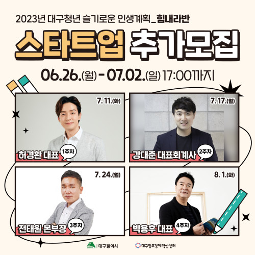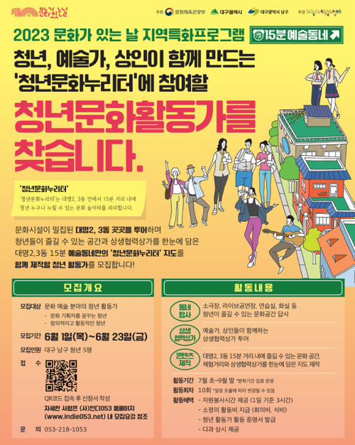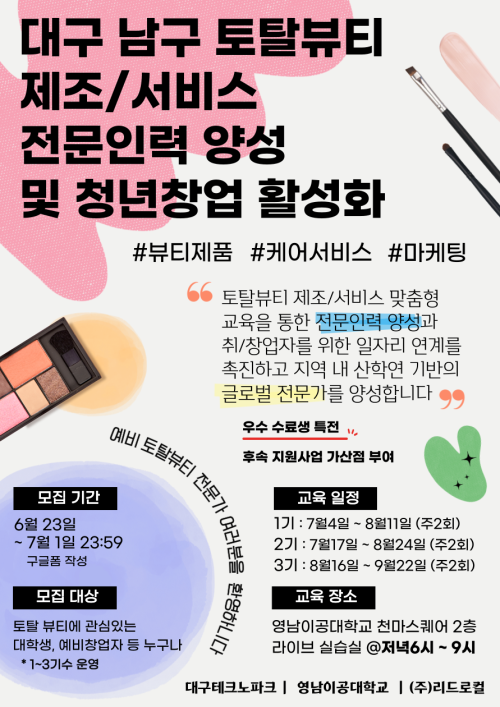 현재 모집 중 검색폼 대구광역시는 해당 페이지를 정보제공을 위한 목적으로 플랫폼을 운영하며, 각 게시글의 내용 및 운영방침에 대한 책임을 지지 않습니다. 대구광역시청년센터 사업 모아보기 전체보기 분야 : 전체 지원사업 채용/인턴/알바 기자단/서포터즈/자원봉사 공모전 교육/강연/토론 축제/공연/전시 커뮤니티활동 기타 정렬 : 전체 신규등록순 모집마감순 상태 : 전체 진행중 종료 기간 설정 검색 검색어 입력 꿀정보등록 누구나 쉽고 빠르게 청년정보를 등록하여 홍보할 수 있습니다. 전체선택 종료 [파괴왕] 배리어프리 영화 쌀롱 파괴왕 ~ 2023.07.03 종료 2023년 「대구청년 슬기로운 인생계획 지원사업」 힘내라 스타트업(1기) 참여 모집 대구광역시/대구창조경제혁신센터 ~ 2023.07.02 종료 <책으로 펼쳐지는 예술의 세계>참여자 모집 아무의 방 ~ 2023.07.02 종료 [수성구청년센터] 청년영상제작지원 수성구청년센터 ~ 2023.07.02 종료 대구 남구 토탈뷰티 제조/서비스 전문인력 양성 및 청년창업 활성화 대구테크노파크, 영남이공대학교, (주)리드로컬 ~ 2023.07.01 종료 환상문학 7~8월 눈마새 금요독서모임 모집 환상문학 ~ 2023.07.01 종료 《도시공원 기록 활동》 워크숍 캄캄콜렉티브 ~ 2023.07.01 종료 2023문화가있는날 지역특화프로그램 청년문화활동가 모집 (사)인디053 ~ 2023.06.30 491 492 493 494 495 496 497 498 499 500