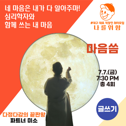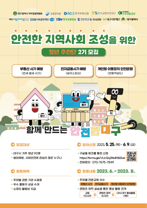 현재 모집 중 검색폼 대구광역시는 해당 페이지를 정보제공을 위한 목적으로 플랫폼을 운영하며, 각 게시글의 내용 및 운영방침에 대한 책임을 지지 않습니다. 대구광역시청년센터 사업 모아보기 전체보기 분야 : 전체 지원사업 채용/인턴/알바 기자단/서포터즈/자원봉사 공모전 교육/강연/토론 축제/공연/전시 커뮤니티활동 기타 정렬 : 전체 신규등록순 모집마감순 상태 : 전체 진행중 종료 기간 설정 검색 검색어 입력 꿀정보등록 누구나 쉽고 빠르게 청년정보를 등록하여 홍보할 수 있습니다. 전체선택 종료 대구퀴어퍼레이드 자원활동가를 모집합니다 대구퀴어문화축제 조직위원회 ~ 2023.06.09 종료 안전한 지역사회 조성을 위한 청년 추진단 2기 모집 대구광역시 자치경찰위원회, 금융감독원, 한국부동산원, 한국교통안전공단, 도로교통공단, 대구지역문제해결플랫폼, DGB사회공헌재단, 한국교통방송, 계명대학교K-OASIS, 대구시민재단 ~ 2023.06.09 종료 기본소득지구네트워크 대회 전국투어 간담회 '현실 속의 기본소득 in 대구' 기본소득대구네트워크 ~ 2023.06.09 종료 2023년 인문실험 공모전 한국출판문화산업진흥원 ~ 2023.06.09 종료 자기소개서 완전정복 대구일자리전환지원센터 ~ 2023.06.09 종료 대구환경교육포럼 대구광역시환경교육센터 ~ 2023.06.08 종료 제15회 대구퀴어문화축제 ‘우리는 이미’ 기획강연 대구퀴어문화축제조직위원회 ~ 2023.06.08 종료 [글쓰기모임] 심리학자와 함께 쓰는 내 마음 나를위함 ~ 2023.06.07 501 502 503 504 505 506 507 508 509 510