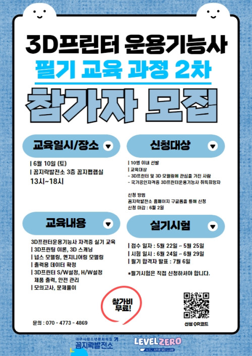 현재 모집 중 검색폼 대구광역시는 해당 페이지를 정보제공을 위한 목적으로 플랫폼을 운영하며, 각 게시글의 내용 및 운영방침에 대한 책임을 지지 않습니다. 대구광역시청년센터 사업 모아보기 전체보기 분야 : 전체 지원사업 채용/인턴/알바 기자단/서포터즈/자원봉사 공모전 교육/강연/토론 축제/공연/전시 커뮤니티활동 기타 정렬 : 전체 신규등록순 모집마감순 상태 : 전체 진행중 종료 기간 설정 검색 검색어 입력 꿀정보등록 누구나 쉽고 빠르게 청년정보를 등록하여 홍보할 수 있습니다. 전체선택 종료 2023년도 환경데이터 활용 및 분석 공모전 환경부 ~ 2023.06.04 종료 ★행복북구 1인가구 6월 프로그램 OPEN★ 대구북구가족센터 ~ 2023.06.03 종료 🎉레벨제로 성과공유회 <반상회> 참여자 모집 🎉 청소년문화의집 꼼지락발전소 ~ 2023.06.03 종료 환상문학 6월 북클럽 & 북토크 모집 환상문학 ~ 2023.06.03 종료 2023년 1인가구 사회적관계망 형성 지원 "하나와 함께 줍깅" 플로깅 활동 추가모집 (2명!) 대구서구가족센터 ~ 2023.06.02 종료 3D프린터 운용기능사 2차 필기 교육 대구광역시청소년문화의집 꼼지락발전소 ~ 2023.06.02 종료 [꼼지락발전소] 레벨제로 위아영 페스티벌 기획단 '제로' 모집 ( ~ 06. 02) 청소년문화의집 꼼지락발전소 ~ 2023.06.02 종료 911연기학원에서 연기/무용/뮤지컬 강사님을 모집합니다! 911연기학원 ~ 2023.06.01 501 502 503 504 505 506 507 508 509 510