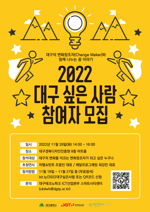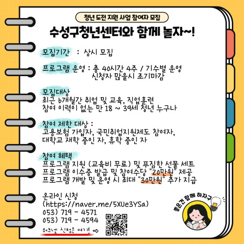 현재 모집 중 검색폼 대구광역시는 해당 페이지를 정보제공을 위한 목적으로 플랫폼을 운영하며, 각 게시글의 내용 및 운영방침에 대한 책임을 지지 않습니다. 대구광역시청년센터 사업 모아보기 전체보기 분야 : 전체 지원사업 채용/인턴/알바 기자단/서포터즈/자원봉사 공모전 교육/강연/토론 축제/공연/전시 커뮤니티활동 기타 정렬 : 전체 신규등록순 모집마감순 상태 : 전체 진행중 종료 기간 설정 검색 검색어 입력 꿀정보등록 누구나 쉽고 빠르게 청년정보를 등록하여 홍보할 수 있습니다. 전체선택 종료 DT 직무체험 프로젝트 추가 모집 진행중 (주)아르케 ~ 2022.11.30 종료 NO.1 공유오피스 대구 동성로 비즈니스 센터 (주)디지스타트업 인큐베이터 ~ 2022.11.30 종료 [ 공모/지원사업 ] 2022년 대구광역시 수성구청년센터 청년도전지원사업 모집 수성구청년센터 ~ 2022.11.30 대구광역시청년센터 종료 2022 청년금융부채상담소 대구광역시청년센터 ~ 2022.11.30 종료 2022 대구싶은사람 대구테크노파크 ~ 2022.11.29 종료 대구 청년 프리랜서 X 예비 청년 창업자 네트워킹 파티 [일로 만날 사이] 053 창업 카페 ~ 2022.11.29 종료 <서울대 공대 출신의 대표님이 어떻게 유튜브 채널의 대표가 되었을 : 올블랑 대표 여주엽님 토크쇼> 대구콘텐츠코리아랩 ~ 2022.11.29 종료 2022 생명평화 활동 발표대회 생명평화아시아 ~ 2022.11.28 551 552 553 554 555 556 557 558 559 560