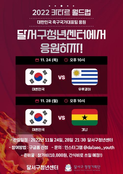 현재 모집 중 검색폼 대구광역시는 해당 페이지를 정보제공을 위한 목적으로 플랫폼을 운영하며, 각 게시글의 내용 및 운영방침에 대한 책임을 지지 않습니다. 대구광역시청년센터 사업 모아보기 전체보기 분야 : 전체 지원사업 채용/인턴/알바 기자단/서포터즈/자원봉사 공모전 교육/강연/토론 축제/공연/전시 커뮤니티활동 기타 정렬 : 전체 신규등록순 모집마감순 상태 : 전체 진행중 종료 기간 설정 검색 검색어 입력 꿀정보등록 누구나 쉽고 빠르게 청년정보를 등록하여 홍보할 수 있습니다. 전체선택 종료 <2022년 대구•의성 청년농부 신활력장터>&<2022년 제4회 대구•경북 청년농부 교남장터> 대구YMCA ~ 2022.11.25 종료 [커피는책이랑] 단편영화 <프리즈마> 상영회 커피는 책이랑 ~ 2022.11.25 종료 라이프 클라우드 [잔상] 제작 공유회 & 스머지 스틱 제작 체험 (주)뷰티인사이드, 초록도 ~ 2022.11.25 종료 대구 청년 누구나 참여 가능한 무료 클래스 오픈!! (수험생 이벤트) 피클스튜디오 ~ 2022.11.25 종료 2022년 달서구 청년도전지원사업 월성종합사회복지관 청년도전지원사업본부 ~ 2022.11.25 대구광역시청년센터 종료 2022 청년상담소 참여자모집 대구광역시청년센터 ~ 2022.11.25 종료 달서구청년센터에서 월드컵 응원하자! 청청기획단x달서구청년센터 달서구 청청기획단 ~ 2022.11.23 종료 어른도 교육이 필요해! [청년내일저축계좌 맞춤형 교육 프로그램] 대구광역자활센터(청년내일저축계좌) ~ 2022.11.23 551 552 553 554 555 556 557 558 559 560