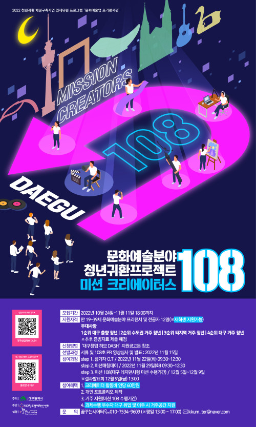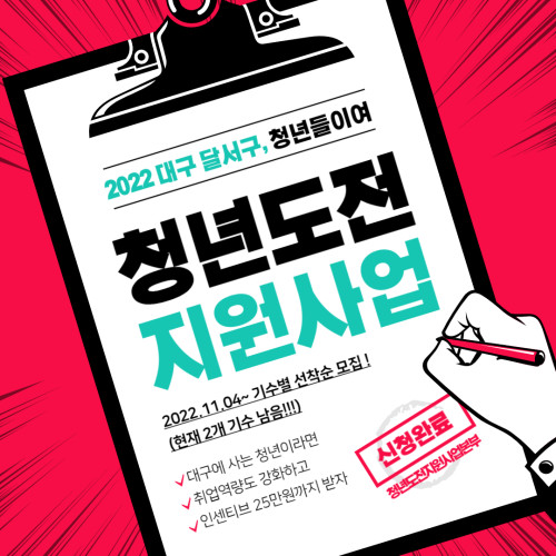 현재 모집 중 검색폼 대구광역시는 해당 페이지를 정보제공을 위한 목적으로 플랫폼을 운영하며, 각 게시글의 내용 및 운영방침에 대한 책임을 지지 않습니다. 대구광역시청년센터 사업 모아보기 전체보기 분야 : 전체 지원사업 채용/인턴/알바 기자단/서포터즈/자원봉사 공모전 교육/강연/토론 축제/공연/전시 커뮤니티활동 기타 정렬 : 전체 신규등록순 모집마감순 상태 : 전체 진행중 종료 기간 설정 검색 검색어 입력 꿀정보등록 누구나 쉽고 빠르게 청년정보를 등록하여 홍보할 수 있습니다. 전체선택 종료 미디어기획특강 : 팬덤문화와 콘텐츠, 새로운 소비자와 산업의 탄생 대구영상미디어센터 ~ 2022.11.11 종료 2022년 달서구 청년도전지원사업 월성종합사회복지관 청년도전지원사업본부 ~ 2022.11.11 종료 《2022 우리목소리》 : 성평등한 세계를 상상하는 작은 축제 어나더스 ~ 2022.11.11 종료 [대구창조경제혁신센터] 문화예술분야 청년귀환 프로젝트 <미션 크리에이터스 108 > 참가자(프리랜서) 모집 대구창조경제혁신센터 ~ 2022.11.11 종료 [동친쌀롱] 클래식플레이리스트 프란츠클래식 ~ 2022.11.11 종료 웜뱃 네번째 프로젝트 - 함께 강정보에서 플로깅(줍깅)해요! 웜뱃 ~ 2022.11.10 종료 [대구 모집] 인문 산책, 다시 읽다가, 잇다가 참여자 모집 한국문화예술위원회, 토핑, 문화체육관광부 ~ 2022.11.10 종료 지식재산권, 어떻게 챙겨야 할까? 053창업카페 ~ 2022.11.09 561 562 563 564 565 566 567 568 569 570