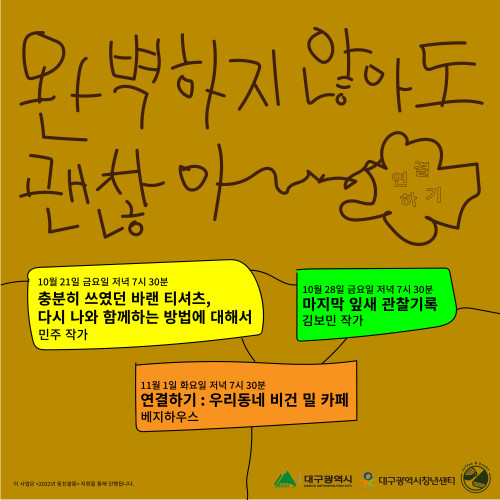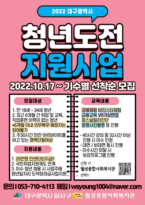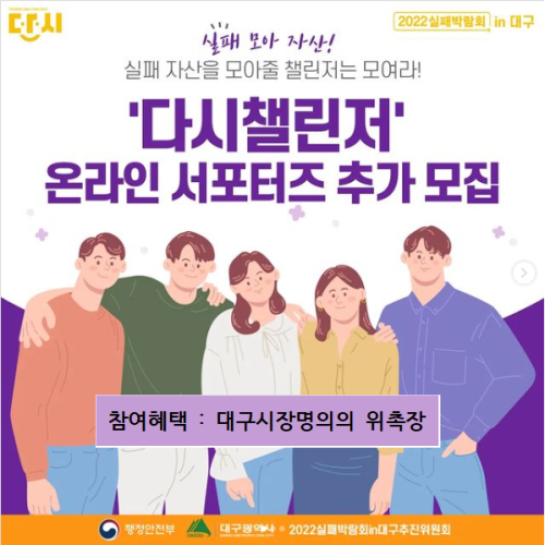 현재 모집 중 검색폼 대구광역시는 해당 페이지를 정보제공을 위한 목적으로 플랫폼을 운영하며, 각 게시글의 내용 및 운영방침에 대한 책임을 지지 않습니다. 대구광역시청년센터 사업 모아보기 전체보기 분야 : 전체 지원사업 채용/인턴/알바 기자단/서포터즈/자원봉사 공모전 교육/강연/토론 축제/공연/전시 커뮤니티활동 기타 정렬 : 전체 신규등록순 모집마감순 상태 : 전체 진행중 종료 기간 설정 검색 검색어 입력 꿀정보등록 누구나 쉽고 빠르게 청년정보를 등록하여 홍보할 수 있습니다. 전체선택 종료 2022년 달서구 청년도전지원사업 월성종합사회복지관 청년도전지원사업본부 ~ 2022.10.21 종료 완벽하지 않아도 괜찮아 : 연결하기 커피는 책이랑 ~ 2022.10.20 대구광역시청년센터 종료 2022 금융다이브(DIVE) 시즌2 참여자 모집 대구광역시 청년센터 ~ 2022.10.20 종료 우주공간 프로젝터 제작 교육 (재)대구테크노파크 스타트라인 ~ 2022.10.19 종료 대기과학자가 들려주는 기후위기 이야기&대화모임 in 대구 생명평화아시아 ~ 2022.10.19 종료 2022분홍돌고래문학관_[당신이 나의 백신입니다]김동은 작가와 함께하는 북 콘서트 대구시민공익활동지원센터 / 분홍돌고래도서관 ~ 2022.10.18 종료 2022 실패박람회 in 대구 다시챌린저 온라인 서포터즈 추가모집 2022 대구실패박람회 운영팀 ~ 2022.10.17 종료 2022년 1인가구 프로그램 대구북구가족센터 ~ 2022.10.17 571 572 573 574 575 576 577 578 579 580