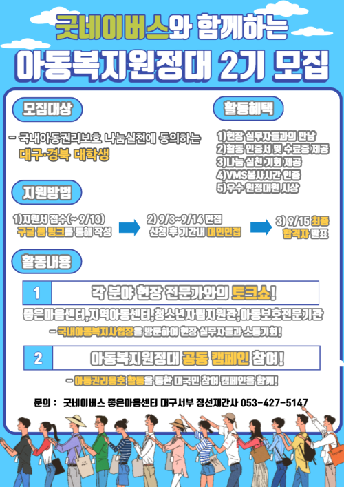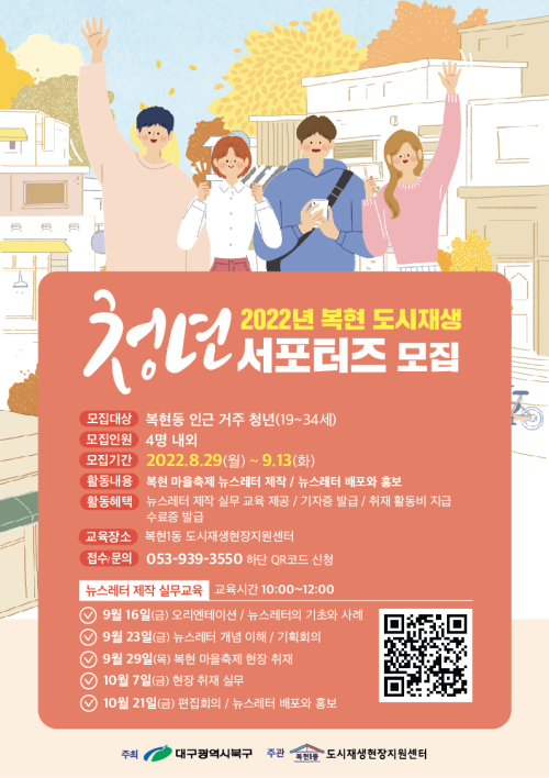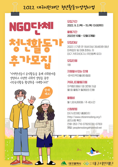 현재 모집 중 검색폼 대구광역시는 해당 페이지를 정보제공을 위한 목적으로 플랫폼을 운영하며, 각 게시글의 내용 및 운영방침에 대한 책임을 지지 않습니다. 대구광역시청년센터 사업 모아보기 전체보기 분야 : 전체 지원사업 채용/인턴/알바 기자단/서포터즈/자원봉사 공모전 교육/강연/토론 축제/공연/전시 커뮤니티활동 기타 정렬 : 전체 신규등록순 모집마감순 상태 : 전체 진행중 종료 기간 설정 검색 검색어 입력 꿀정보등록 누구나 쉽고 빠르게 청년정보를 등록하여 홍보할 수 있습니다. 전체선택 종료 루키 크리에터 육성 프로그램 참가팀 모집 대구디지털혁신진흥원 ~ 2022.09.15 종료 CNC라우터 사용방법 및 설계프로그램 기초 이론 교육 (재)대구테크노파크 스타트라인 ~ 2022.09.15 종료 2022년 청년사회활동가양성사업(청년NGO) 7차 추가청년(인턴) 모집 대구시민재단 ~ 2022.09.15 종료 포항 수해복구 자원봉사자 모집 수성구자원봉사센터 ~ 2022.09.14 종료 [동친쌀롱]사건은 식후에 벌어진다 브쇼 ~ 2022.09.14 종료 복현청년 소셜리빙랩 시즌4 참가자모집; 도시재생과 로컬브랜드 개발 복현1동 도시재생현장지원센터 ~ 2022.09.13 종료 2022 복현 도시재생 청년 서포터즈 모집 복현1동 도시재생현장지원센터 ~ 2022.09.13 종료 굿네이버스 아동복지원정대 Up-road 2기 모집 굿네이버스 좋은마음센터 대구서부지부 ~ 2022.09.13 591 592 593 594 595 596 597 598 599 600