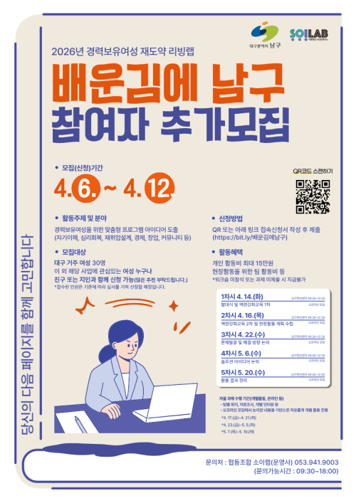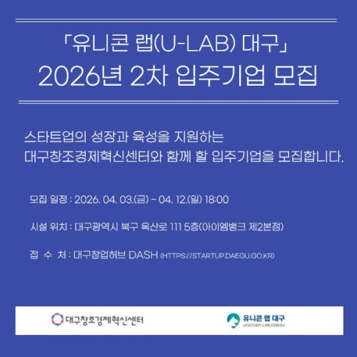 현재 모집 중 검색폼 대구광역시는 해당 페이지를 정보제공을 위한 목적으로 플랫폼을 운영하며, 각 게시글의 내용 및 운영방침에 대한 책임을 지지 않습니다. 대구광역시청년센터 사업 모아보기 전체보기 분야 : 전체 지원사업 채용/인턴/알바 기자단/서포터즈/자원봉사 공모전 교육/강연/토론 축제/공연/전시 커뮤니티활동 기타 정렬 : 전체 신규등록순 모집마감순 상태 : 전체 진행중 종료 기간 설정 검색 검색어 입력 꿀정보등록 누구나 쉽고 빠르게 청년정보를 등록하여 홍보할 수 있습니다. 전체선택 진행중 내 손안의 청년정보 '오픈채팅방' 오픈 대구 ~ 2026.04.11 진행중 「배운김에 남구」 참여자 추가모집 협동조합 소이랩 ~ 2026.04.12 진행중 AI 기반 UXUI 설계 프로젝트 과정 사전 신청 OPEN🔥 인사이드아웃 ~ 2026.04.12 진행중 브랜드 실전 AI 마케팅 프로젝트 과정 사전 신청 OPEN🔥 인사이드아웃 ~ 2026.04.12 진행중 「유니콘 랩(U-Lab) 대구」 2026년 2차 입주기업 모집 (재)대구창조경제혁신센터 ~ 2026.04.12 진행중 고용노동부 전략생태계구축사업 담당인력 채용 (공공사업 운영+회계행정) (사)커뮤니티와경제 ~ 2026.04.13 진행중 2026년 아울러사회적협동조합 디자이너, 문화기획자 공개채용 아울러사회적협동조합 ~ 2026.04.13 진행중 [원데이 클래스] 스마트폰 촬영 기법 대구중구생활문화센터 ~ 2026.04.13 1 2 3 4 5 6 7 8 9 10