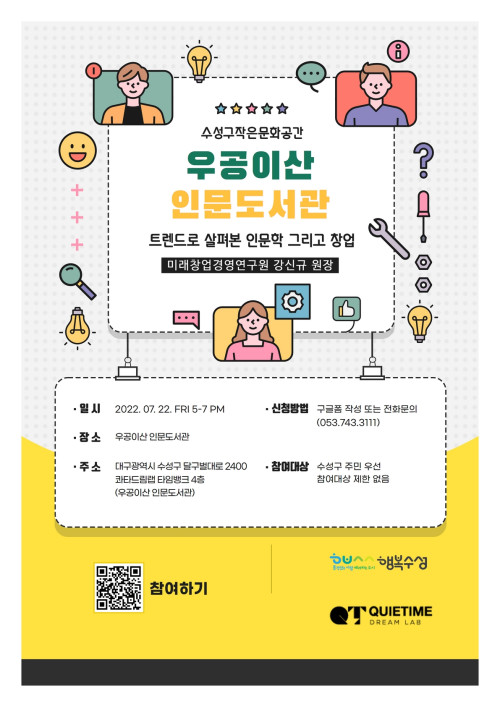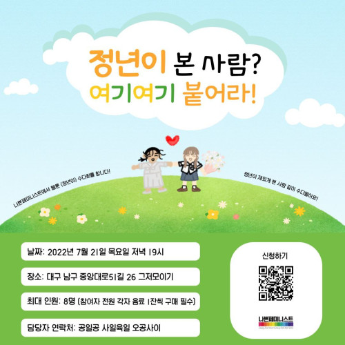 현재 모집 중 검색폼 대구광역시는 해당 페이지를 정보제공을 위한 목적으로 플랫폼을 운영하며, 각 게시글의 내용 및 운영방침에 대한 책임을 지지 않습니다. 대구광역시청년센터 사업 모아보기 전체보기 분야 : 전체 지원사업 채용/인턴/알바 기자단/서포터즈/자원봉사 공모전 교육/강연/토론 축제/공연/전시 커뮤니티활동 기타 정렬 : 전체 신규등록순 모집마감순 상태 : 전체 진행중 종료 기간 설정 검색 검색어 입력 꿀정보등록 누구나 쉽고 빠르게 청년정보를 등록하여 홍보할 수 있습니다. 전체선택 종료 2022년 대구광역시 동구 청년도전지원사업 참여자 모집 대구 동구청년센터 the꿈 ~ 2022.07.22 종료 메이커 프로젝트 지원사업 대구광역시청소년문화의집 꼼지락발전소 ~ 2022.07.22 종료 대구에서 대화로 그리는 세대일기 <우리들의 라떼> 책방일지 ~ 2022.07.22 종료 2022 우공이산 인문도서관 콰타드림랩 ~ 2022.07.21 종료 어른이 토크콘서트 '디지털성범죄 파헤치기' 수성구청년센터 ~ 2022.07.21 종료 정년이 수다회 <정년이 본 사람? 여기여기 붙어라!> 나쁜페미니스트 ~ 2022.07.21 종료 [참여자 모집] 2022년 대구지역문제해결플랫폼 의제실행협약식 온라인 참가자 모집 대구지역문제해결플랫폼 ~ 2022.07.20 종료 대구 청년 1인가구 영화동아리 대구서구가족센터 ~ 2022.07.20 611 612 613 614 615 616 617 618 619 620